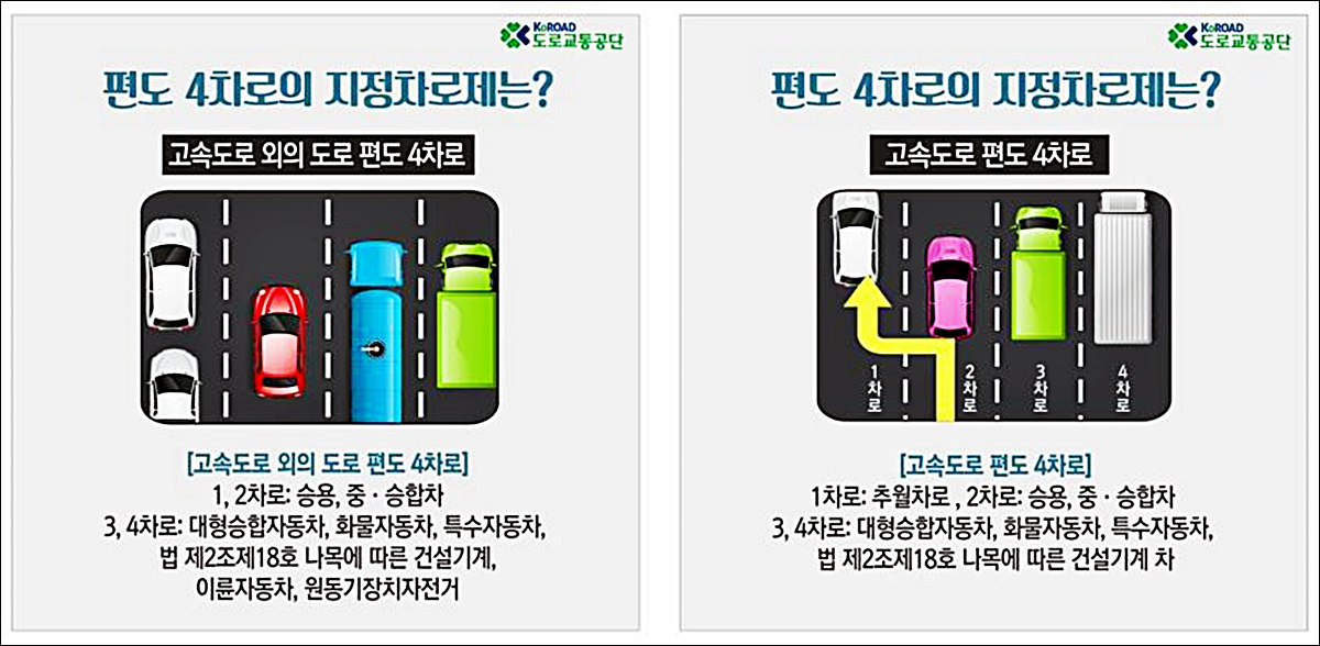 1차로 : 2차로가 주행차로인 자동차의 앞지르기 차로 2차로 : 승용자동차, 중 소형 승합자동차의 주행차로 3차로 : 대형 승합자동차, 적재중량이 1.5t 이하인 화물자동차의 주행차로 4차로 : 적재중량이 1.5t 초과인 화물자동차, 특수자동차 및 건설기계의 주행차로 |