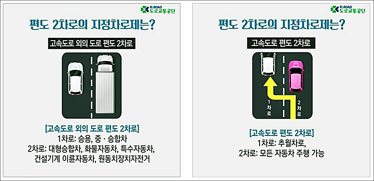 | ※ 지정차로제는 차량의 크기 및 속도 특성에 따라 통행 차로가 다르므로, | |