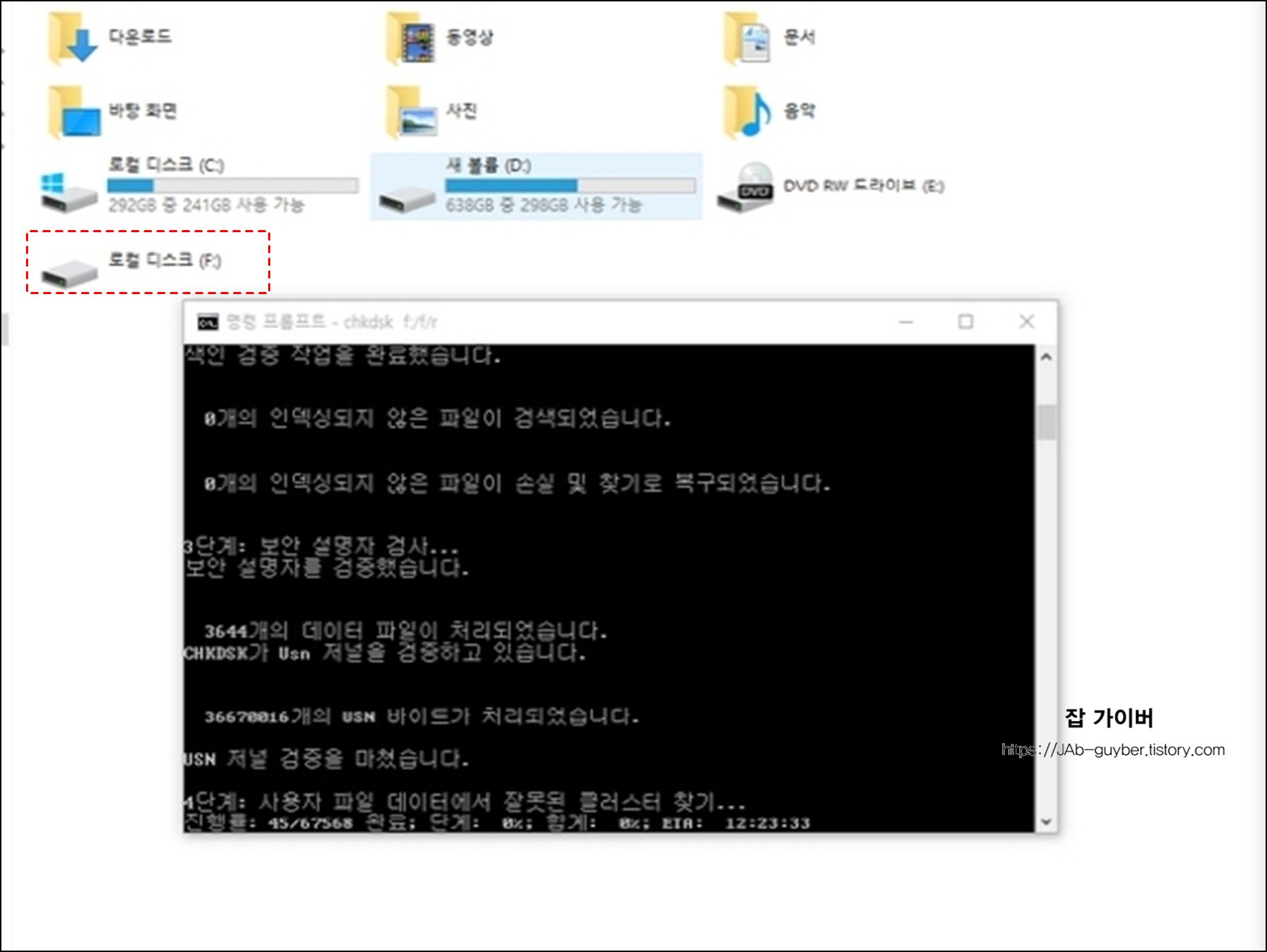 예를 들어, F 드라이브를 복구하려면 아래와 같이 입력합니다.
