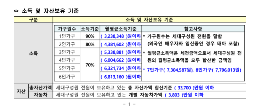 신청 자격은 소득과 자산 기준을 충족해야 합니다. 예를 들어 1인 가구는 월 평균 소득 431만 원 이하여야 하며, 맞벌이 4인 가구의 경우 소득 1,029만 원 이하로 자격을 충족할 수 있습니다. 또한, 자산 기준도 중요한데, 부동산 자산 2억1,550만 원 이하와 자동차 가액 3,803만 원 이하여야 합니다. 자녀를 출산한 가정은 일부 요건이 완화되므로, 해당 가정은 자격을 확인하는 것이 중요합니다.
