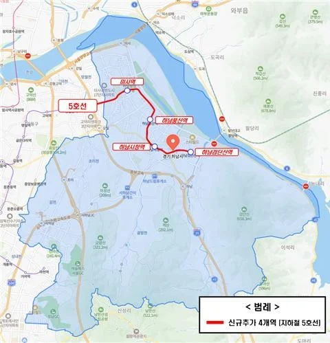 하남선 기준으로 미사역, 하남풍산역, 하남시청역, 하남검단산역 4개 역에서 승하차가 가능합니다. 이 확대로 5호선은 전 구간 이용 범위로 보면 됩니다.