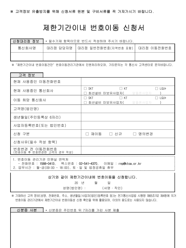 그 다음에는 KTOA 홈페이지에서 ‘이동전화 제한기간이내 번호이동 신청서’를 다운로드해야 한다.