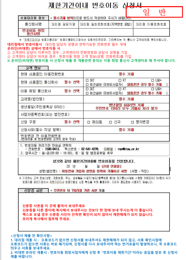 작성 시에는 현재 사용 중인 통신사와 번호이동을 희망하는 통신사 정보를 모두 기입해야 하고, 특히 알뜰폰을 사용하는 경우에는 '회선설비 미보유사업자'를 체크한 뒤 괄호 안에 해당 통신사의 이름과 사용하는 망(KT, SKT, LGU+)까지 정확히 써줘야 한다. 생년월일은 주민등록상의 6자리만 작성하면 되고, 사업자가 아닌 이상 사업자번호는 작성하지 않아도 된다.