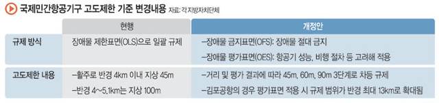 예전에는 활주로 주변 반경을 기준으로 한 줄로 높이 제한을 설정했지만, 앞으로는 OFS(금지 표면)과 OES(평가 표면)로 구분해 단계별로 제한을 두는 방식이 적용된다.