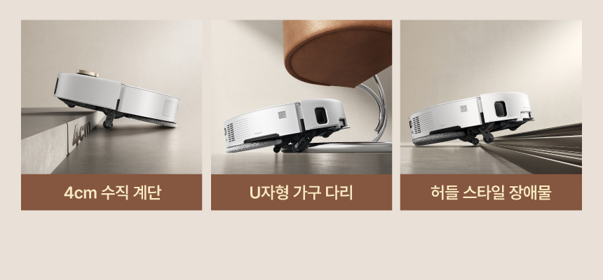 최대 6cm 높이의 문턱이나 단차도 무리 없이 오르내리며 집안 구석구석 이동합니다.