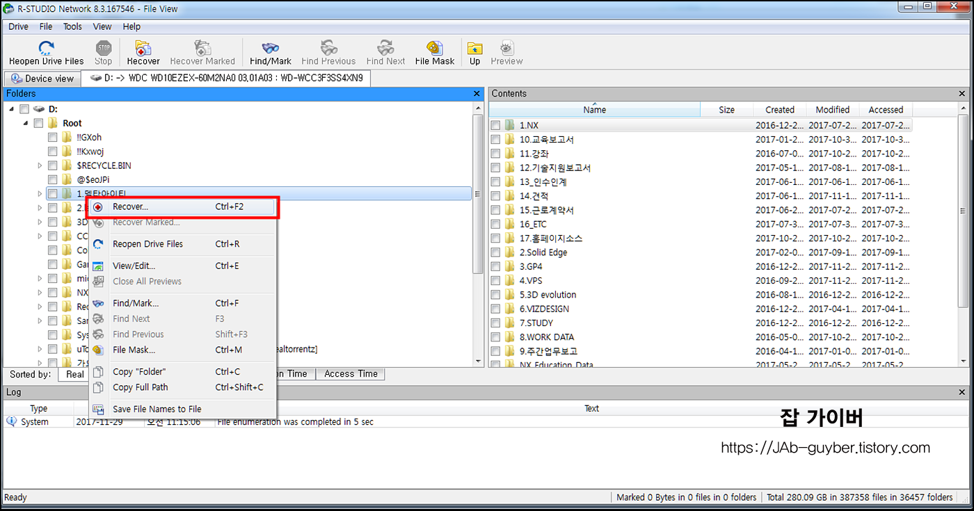 그럼 이미 삭제된 폴더가 보이는데 그중에서 복구할 폴더를 선택 후 마우스 우클릭을 하면 Recover 버튼을 클릭합니다.