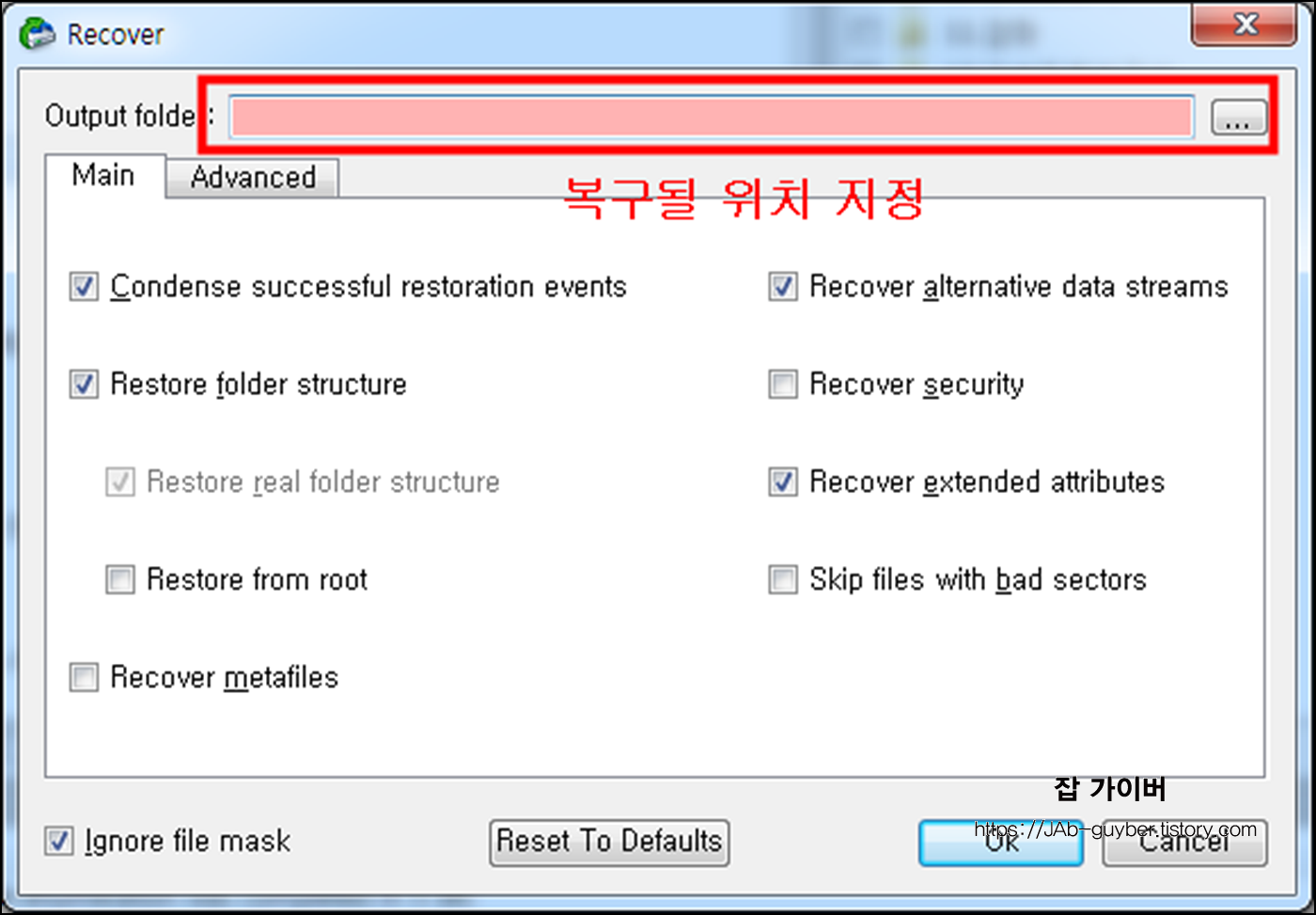 보기와 같이 설정 후 Output Folder에 복구된 데이터를 저장할 위치를 지정합니다.