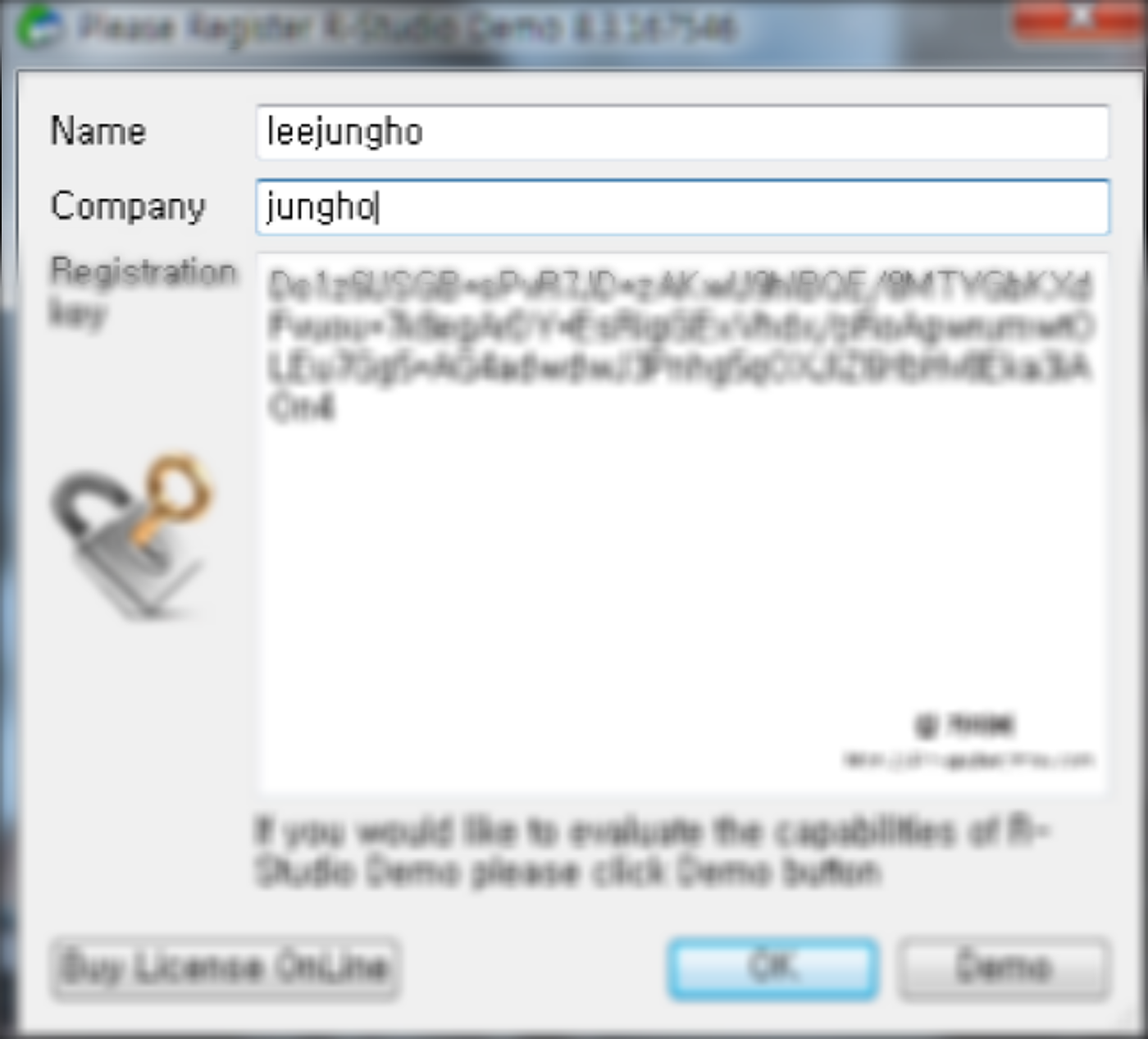 이름과 회사는 대충 입력 후 정품 라이센스키를 입력해주면 정상적으로 등록이 완료됩니다.