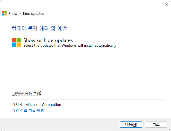 - Show or Hide Updates 도구 사용: 문제되는 업데이트 자동 설치 차단