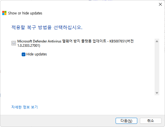나중에 Microsoft에서 문제를 수정한 새로운 패치가 나오면 숨김을 해제하고 정상적으로 설치하면 됩니다.