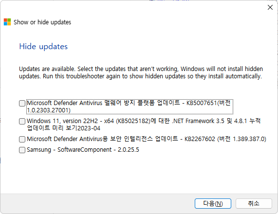 설치를 원하지 않거나 오류를 유발하는 업데이트를 선택합니다. 이렇게 숨긴 업데이트는 Windows 업데이트 과정에서 설치되지 않습니다.