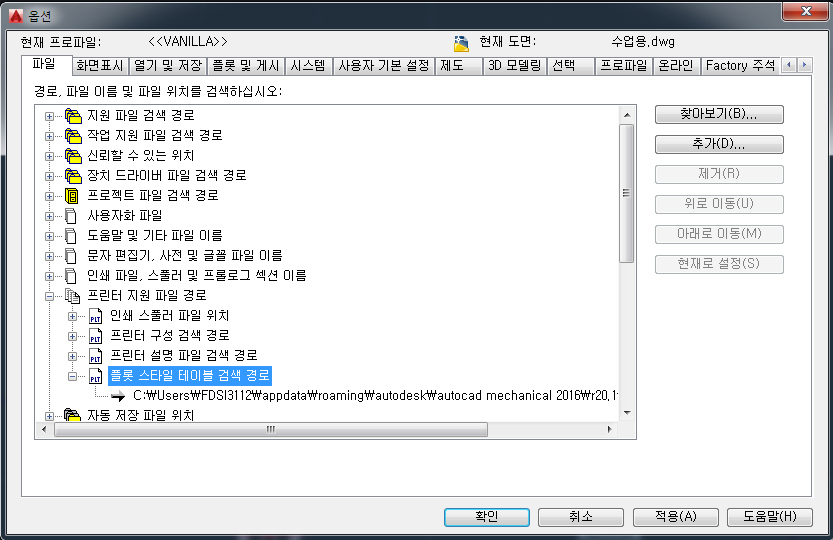 실행 시 플롯 스타일 폴더가 바로 열리며, 오토캐드 옵션에서 지정된 경로와 실제 파일 경로가 일치하는지 확인하는 것이 중요하며 만약 다르다면 경로를 수정해야 하며, 숙련된 사용자들은 아예 플롯 스타일을 별도의 폴더로 관리해 혼란을 방지하기도 합니다.