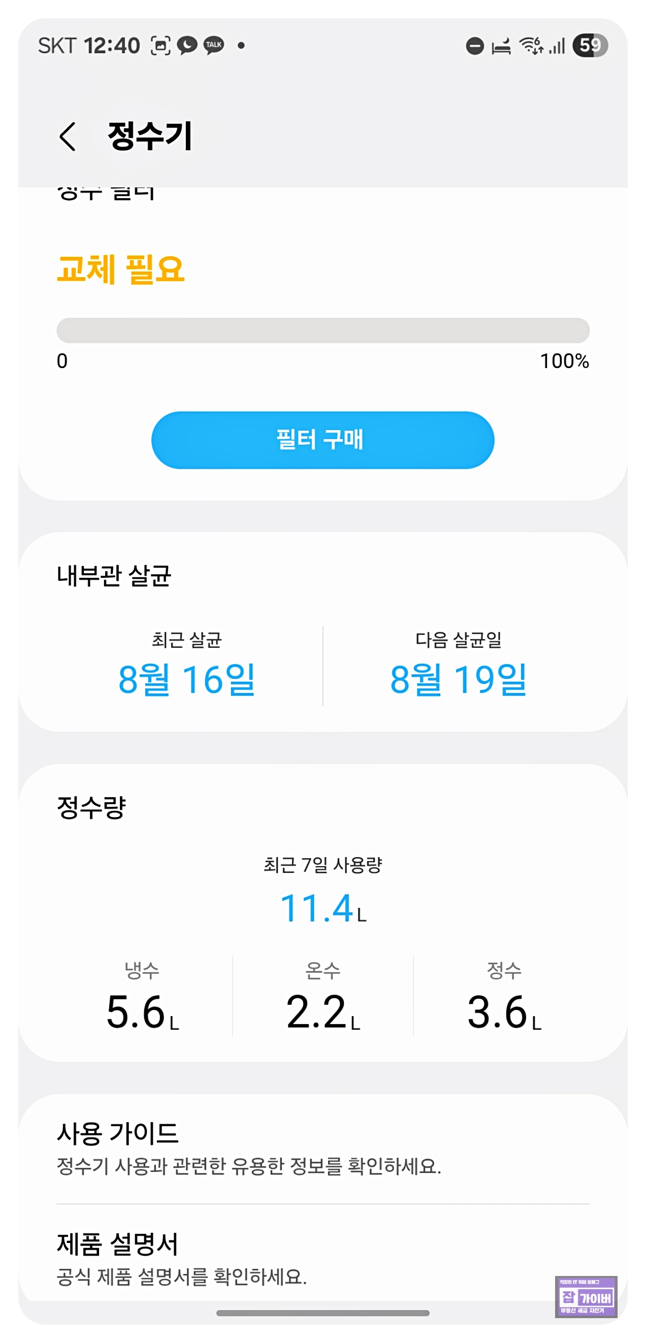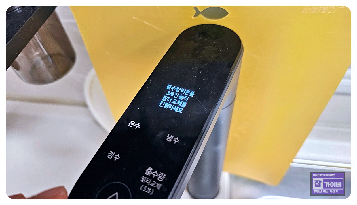 화면에 필터 잔여량이 %로 표시되고, 10% 이하로 내려가면 계속 교체 알람이 떠서 깜빡할 일이 없어요. 저희 집은 두 명이 사용하는데, 하루 평균 11L 정도 사용하다 보니 1년 조금 넘는 시점에서 교체 알림이 떴습니다.