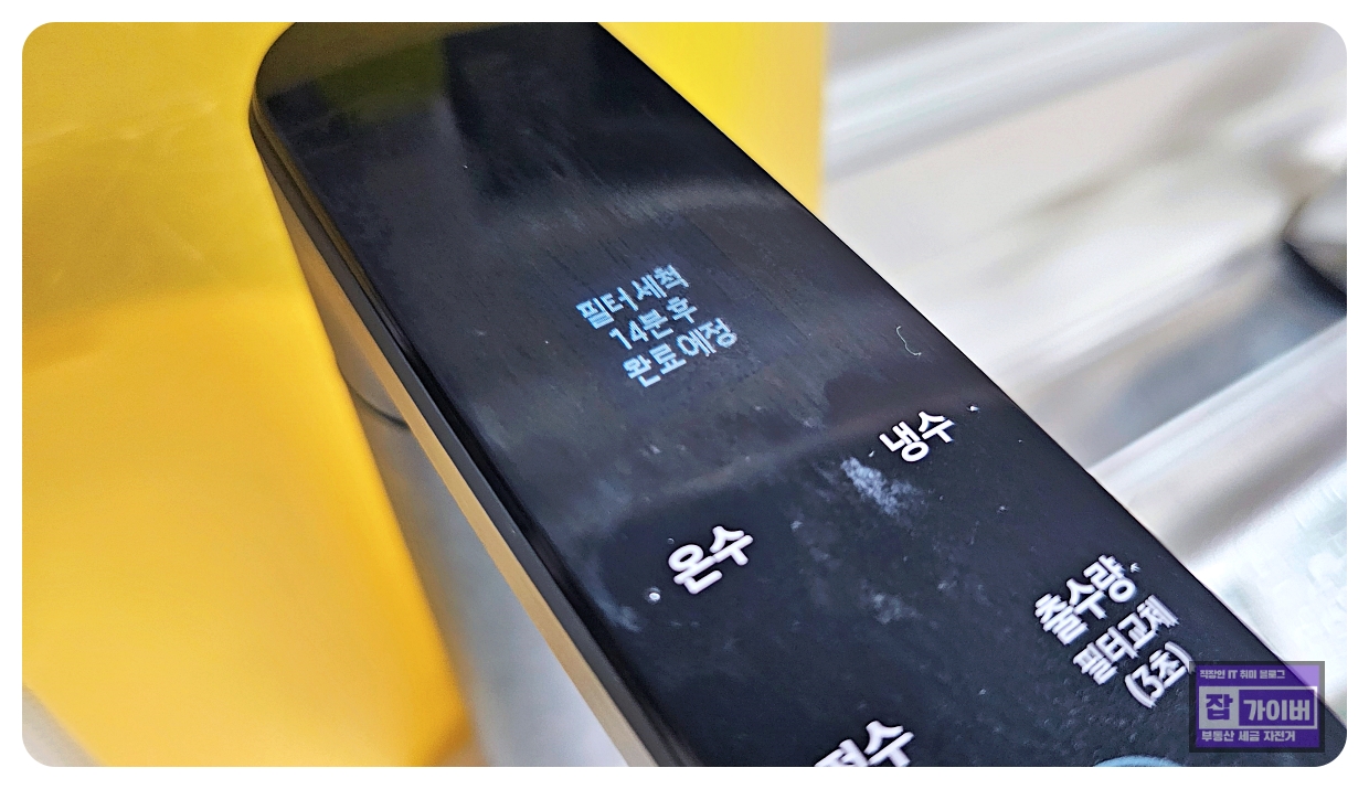 교체 직후에는 반드시 자동 세척 과정을 마쳐야 합니다. 약 12분 정도 소요되며, 이 과정을 거쳐야 새 필터가 안정화되고 안전하게 사용할 수 있습니다.