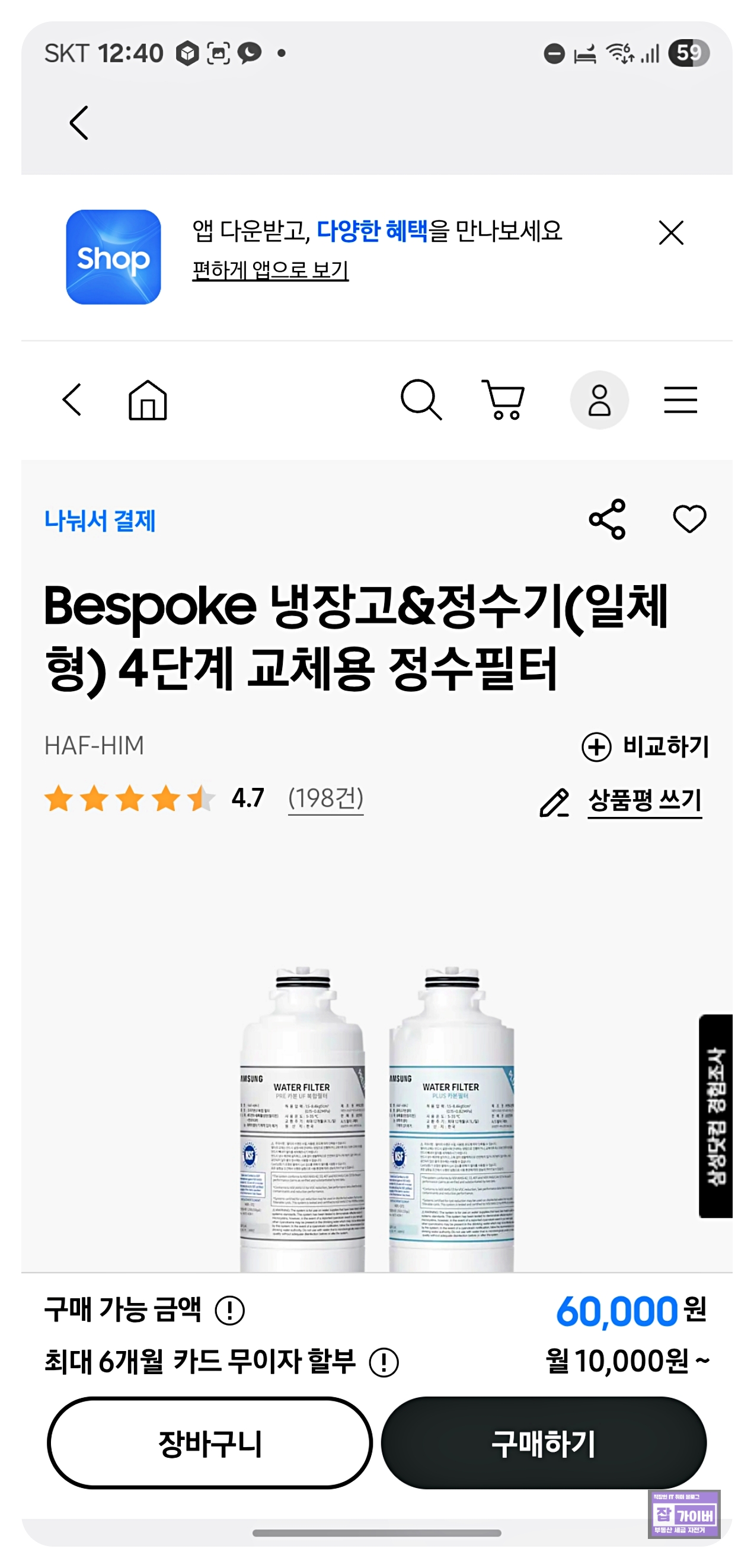 정수기 필터는 네이버나 오픈마켓에서 검색하면 조금 더 저렴해 보이지만, 실제로는 삼성 멤버십 앱에서 구입하면 추가 할인과 무료 배송 혜택이 있어서 큰 차이는 없었습니다. 다만, 저희는 재고가 없어 약 일주일 정도 배송이 지연되었어요.