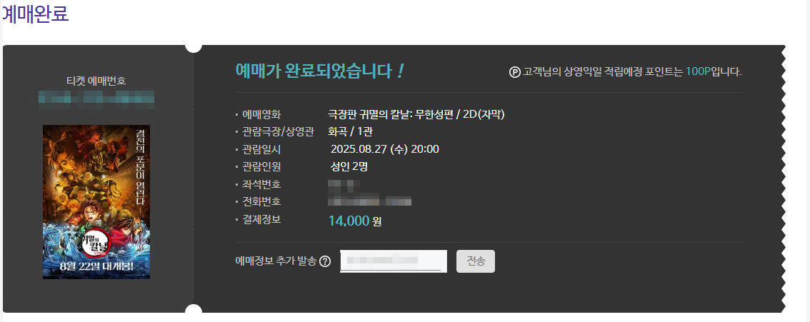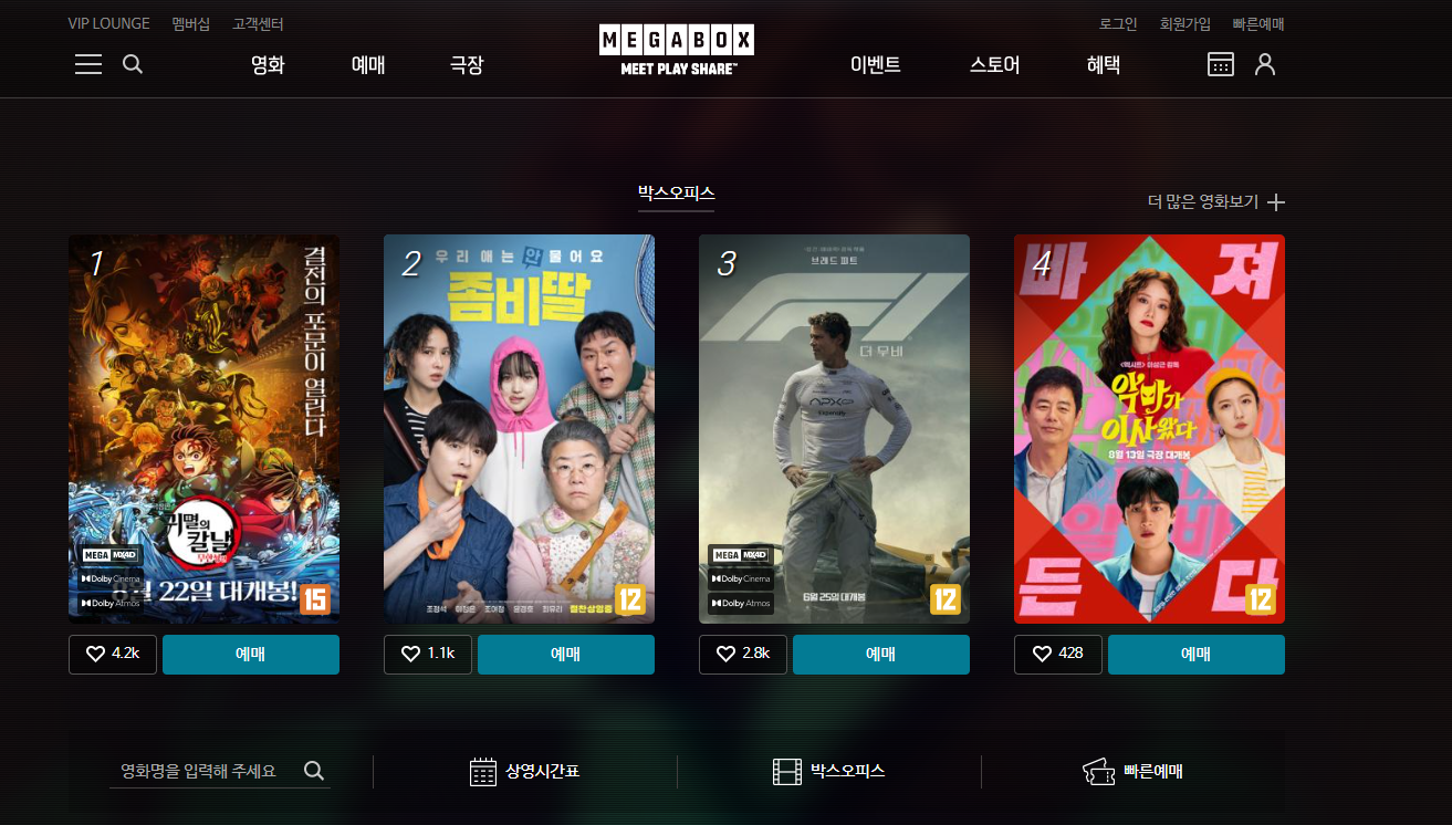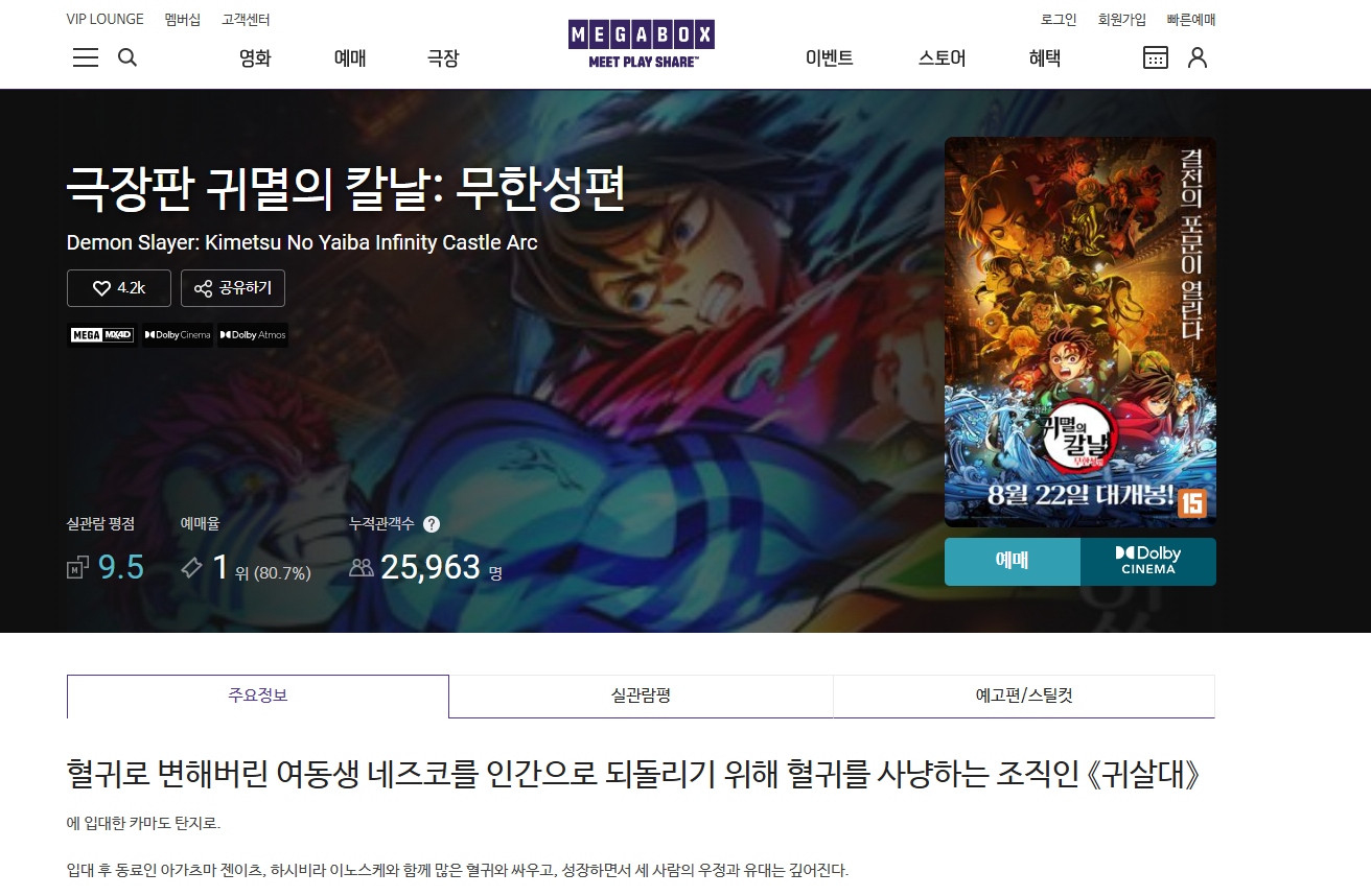 제가 선택한 작품은 귀멸의 칼날: 무한성편 극장판이었는데, 사실 작품에 대한 기대감도 있었지만 "천 원에 본다"는 메리트가 가장 컸습니다.