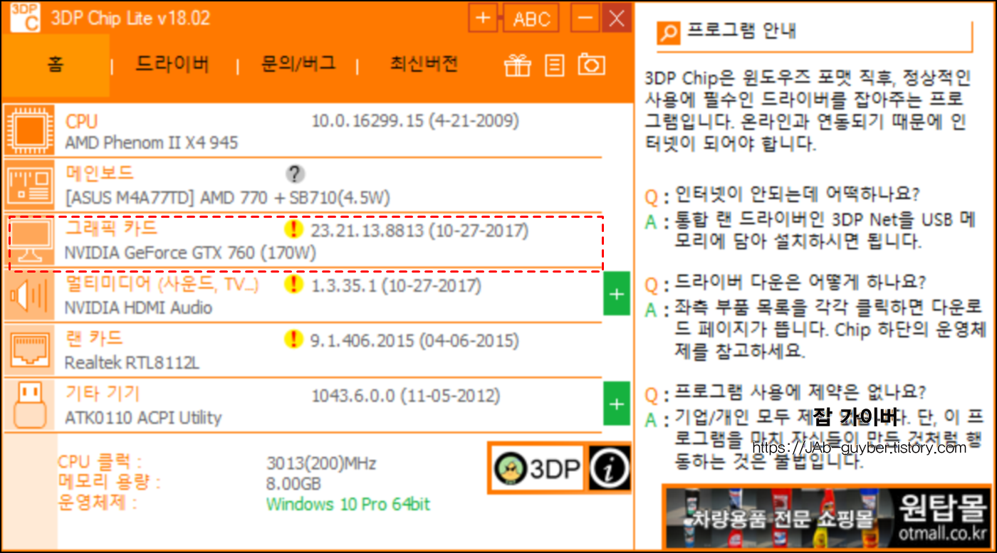 그래서 이번에는 3DP CHIP 이라는 간단한 프로그램을 이용해서 모델을 몰라도 쉽게 그래픽카드 드라이브를 최신 버전으로 업데이트하는 방법을 알아보겠습니다.