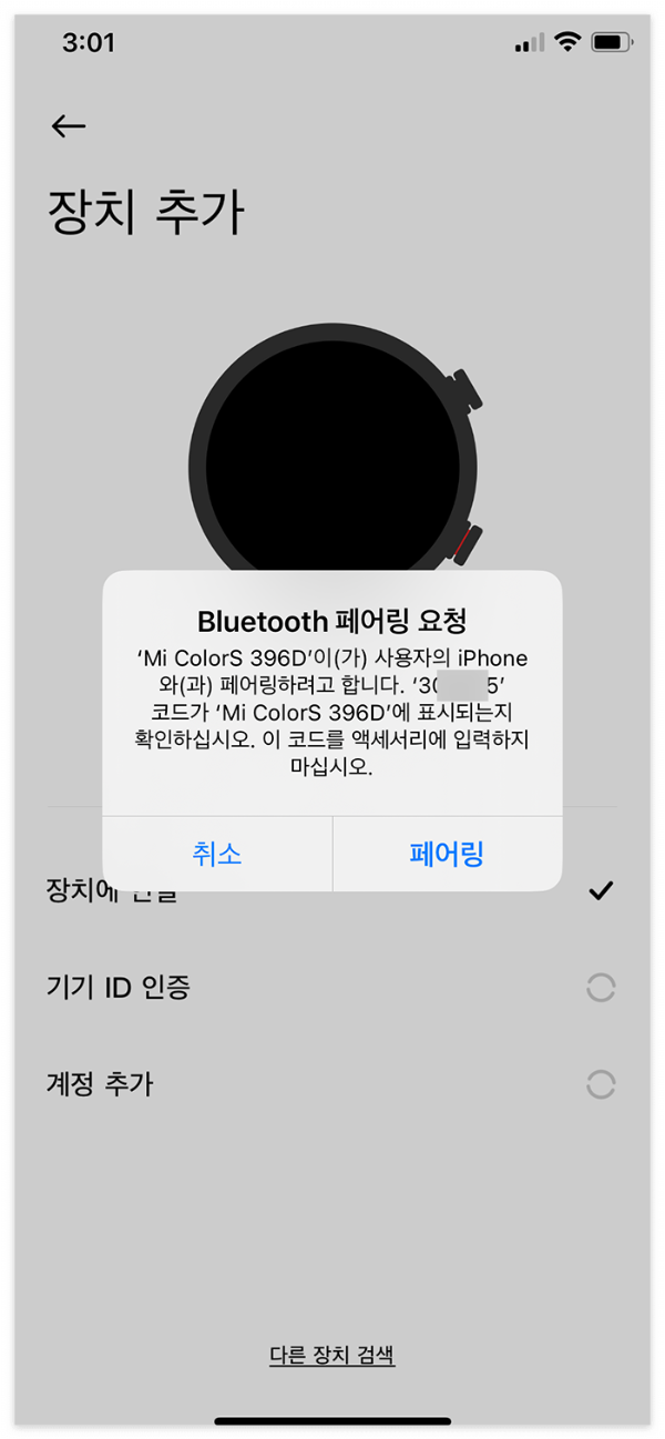 아이폰 블루투스를 켠 뒤 Mi Fitness에서 장치 추가를 눌러 미워치5를 선택합니다. 화면에 표시되는 코드가 일치하면 연결을 승인하면 됩니다.
