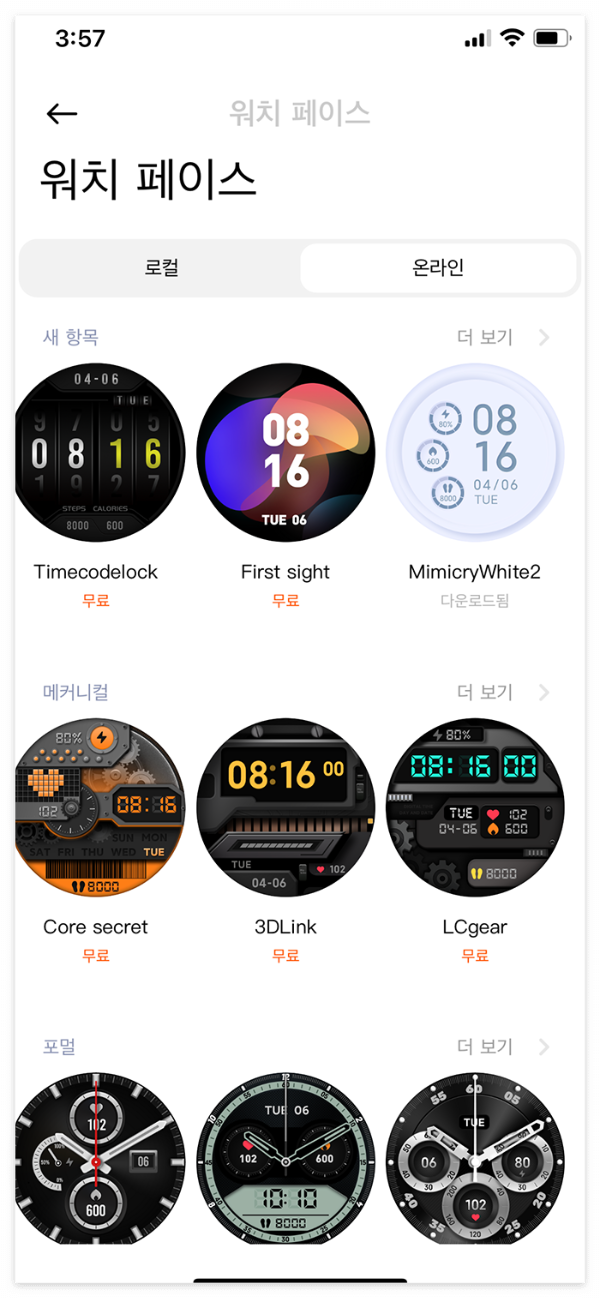 Mi Fitness 앱에서 장치 → 온라인 배경화면으로 들어가면, 취향대로 받아서 바로 적용할 수 있습니다. 미워치5가 은근 “시계 꾸미는 재미”가 있어요.