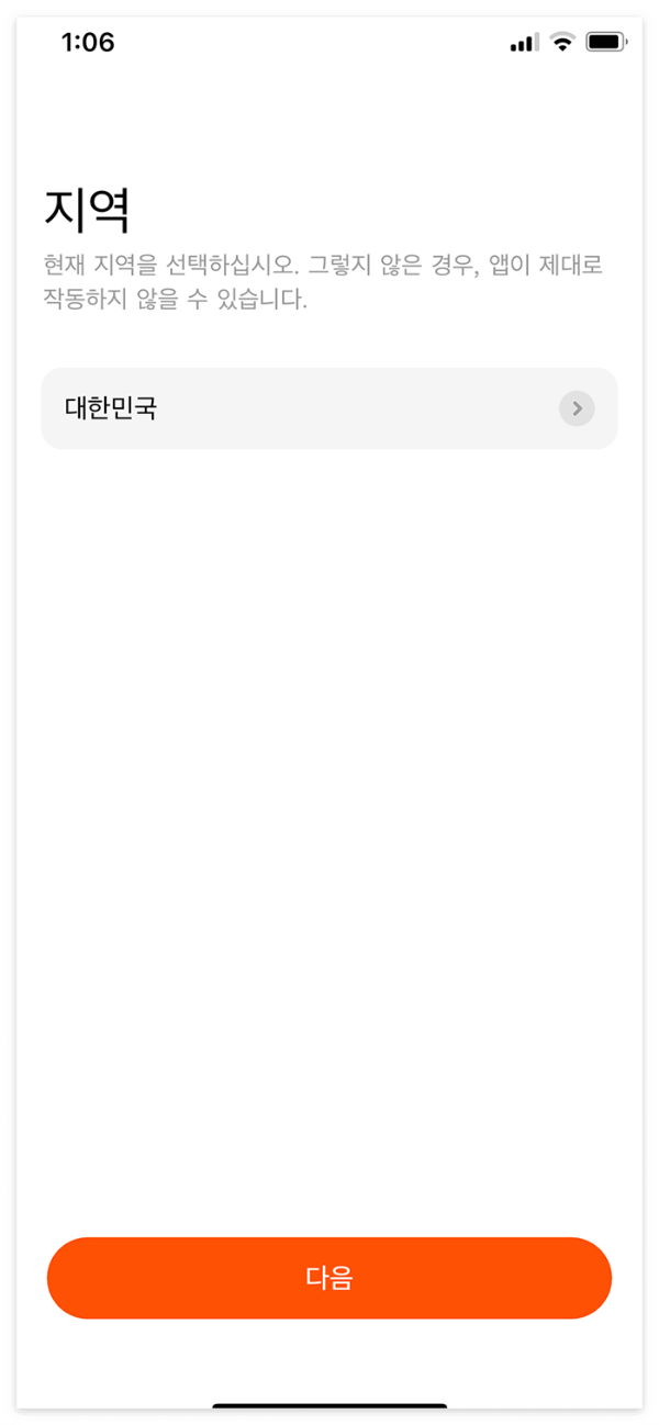 실행 후 필수 약관만 동의하고, 지역은 대한민국으로 설정해두면 이후 알림/권한 설정이 덜 꼬입니다.