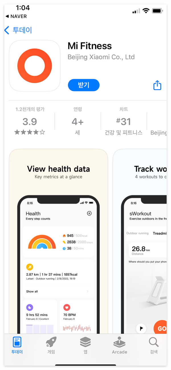 앱스토어에서 Mi Fitness를 검색해 설치합니다. 또는 미워치5 전원을 켰을 때 나오는 QR 코드를 스캔해 설치해도 됩니다.
