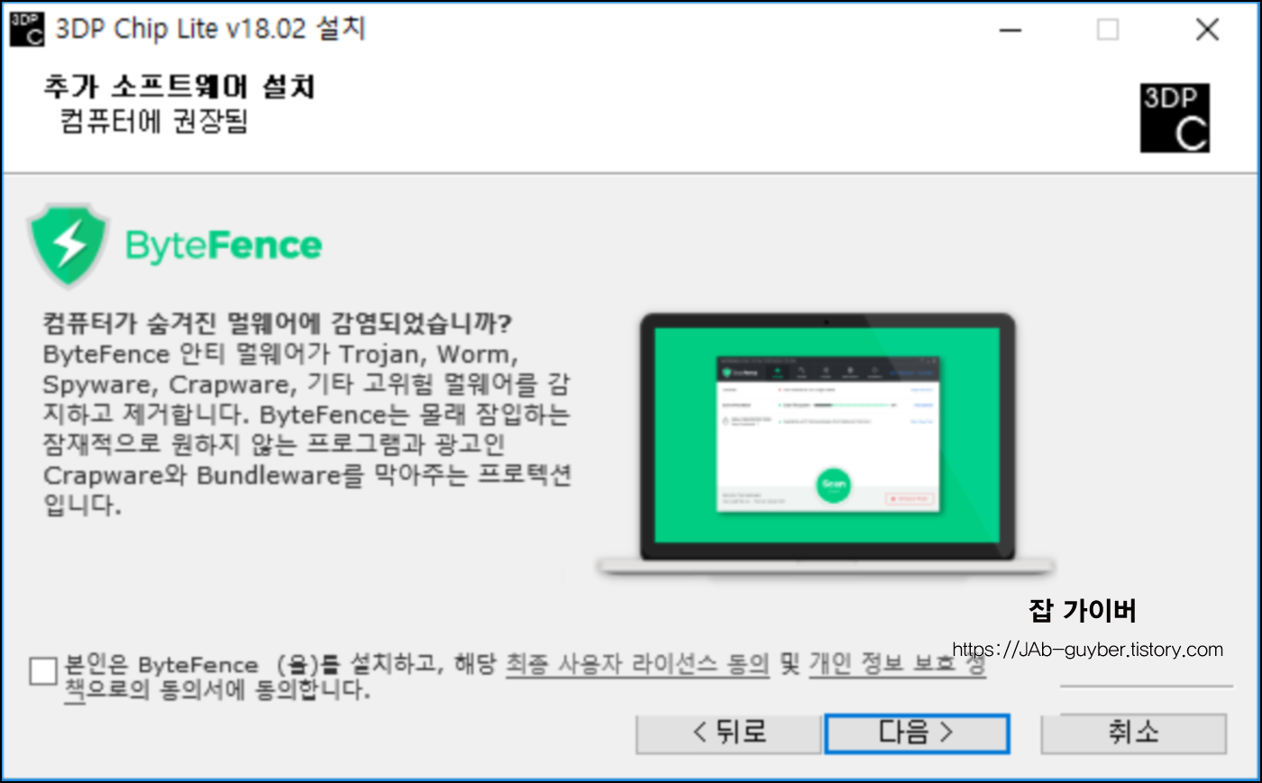 설치 시 백신 프로그램인 AVG와 ByteFence 가 자동 설치되는데 필요 없다면 체크 해제하세요.