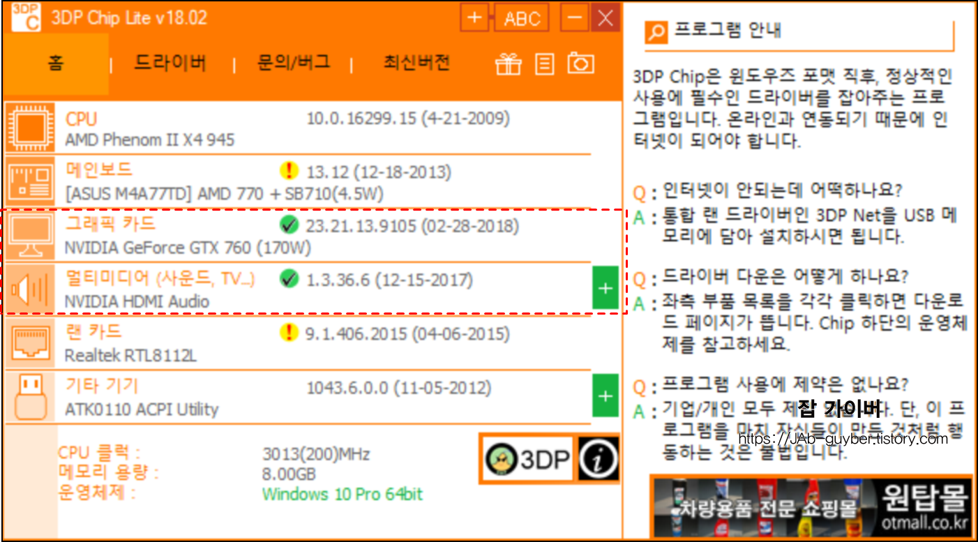 이렇게 설치가 완료 후 실행을 하면 현재 자신이 사용 중인 CPU와 메인보드 그래픽카드, 멀티미디어, 랜카드, 기타 기기에 대한 모델명과 드라이브가 활성화됩니다.
