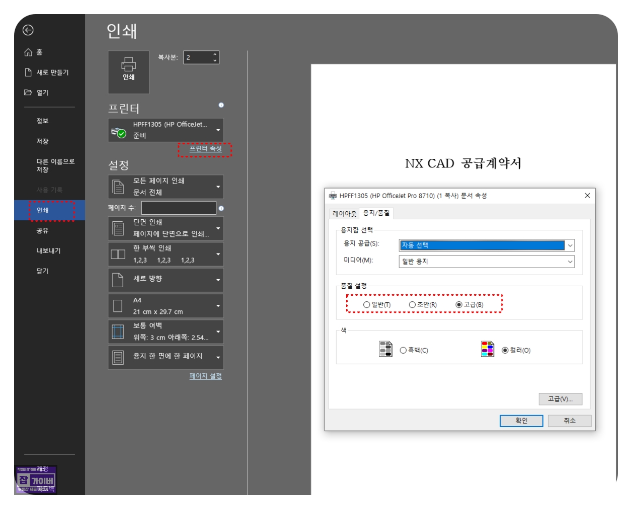 - 용지 설정 점검 : 인쇄 품질을 ‘일반’에서 ‘고급’으로 변경해도 개선이 없는 경우 내부 문제일 수 있습니다.
