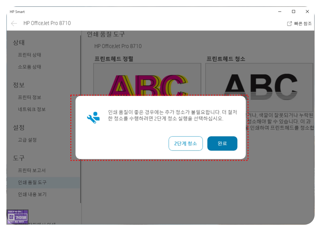 청소를 반복해도 인쇄 품질이 나아지지 않는다면 프린터 헤드가 심하게 막혔거나 손상되었을 가능성이 있습니다.