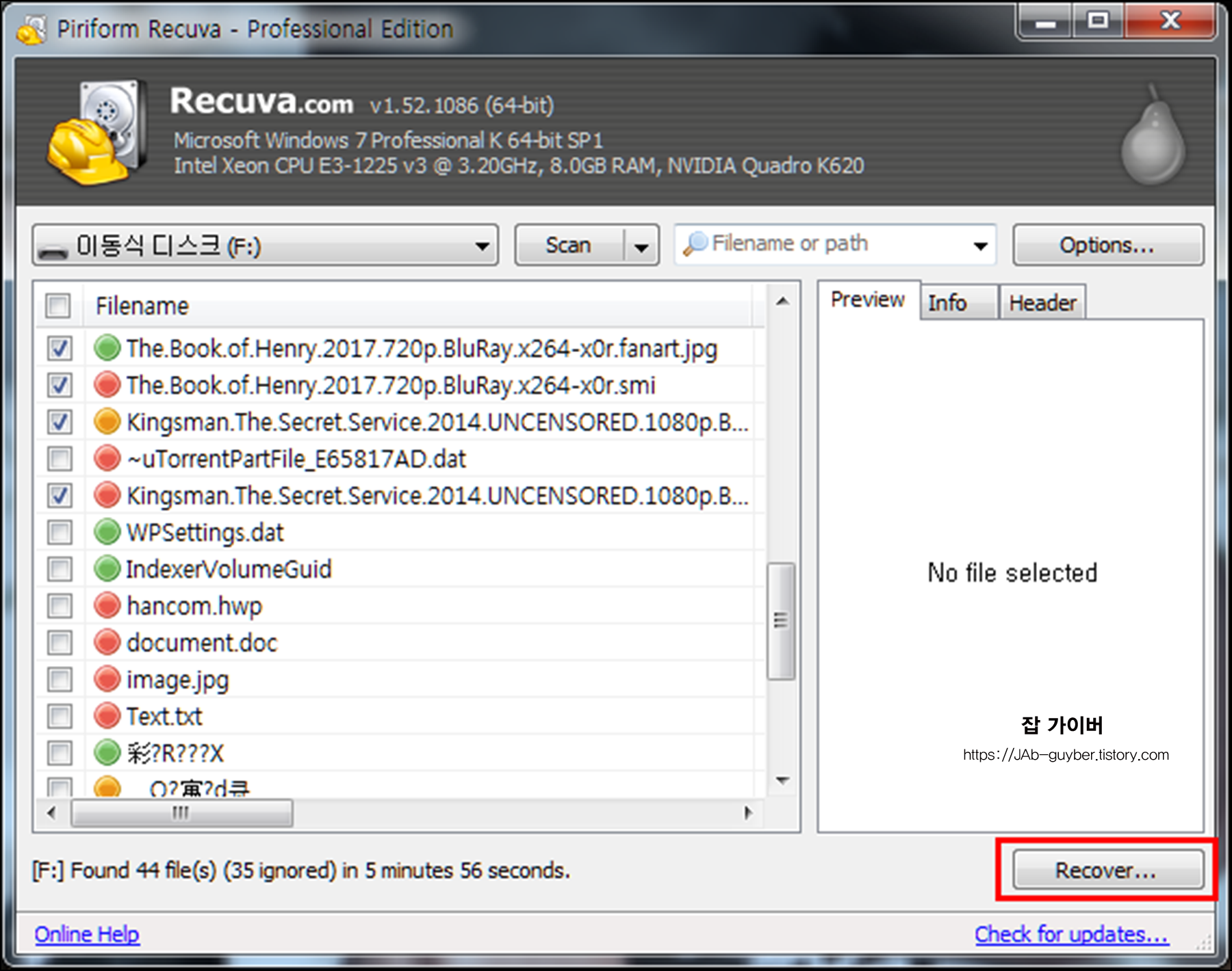 복구하고자 하는 파일 등을 체크 후 Recover 버튼을 눌러 복구하고자 하는 위치에 지정합니다.