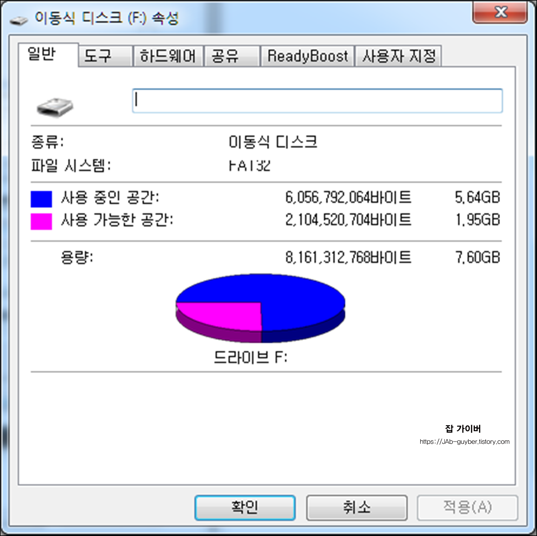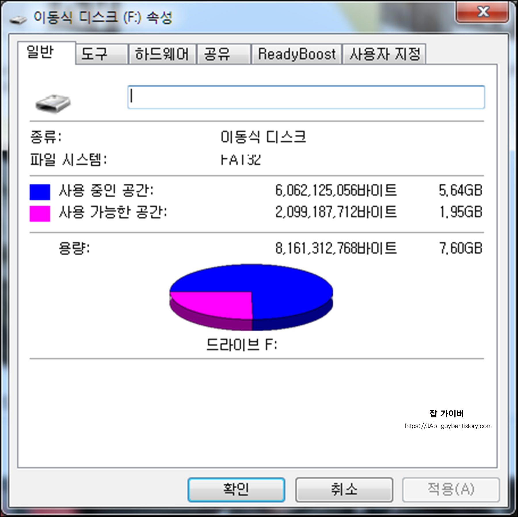 우선 데이터를 복구하기 전 테스트를 위해 usb를 준비해서 삭제 전에 용량을 체크해봅니다.