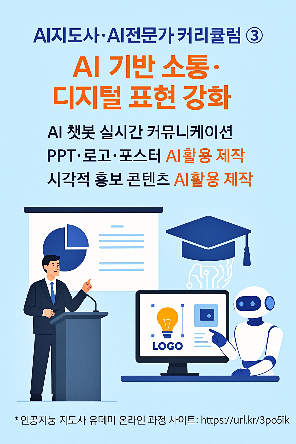 고급 과정으로, 2급 과정을 지도할 수 있는 권한까지 주어지는 전문가 자격입니다. AI를 활용한 창의적 콘텐츠 제작, AI 기반 커뮤니케이션, 윤리적 활용 등 심화 교육을 이수하게 되며, 이후 AI 지도사로 활동하거나 교육 과정을 운영할 수 있습니다. - 인공지능 활용역량 검증 1급