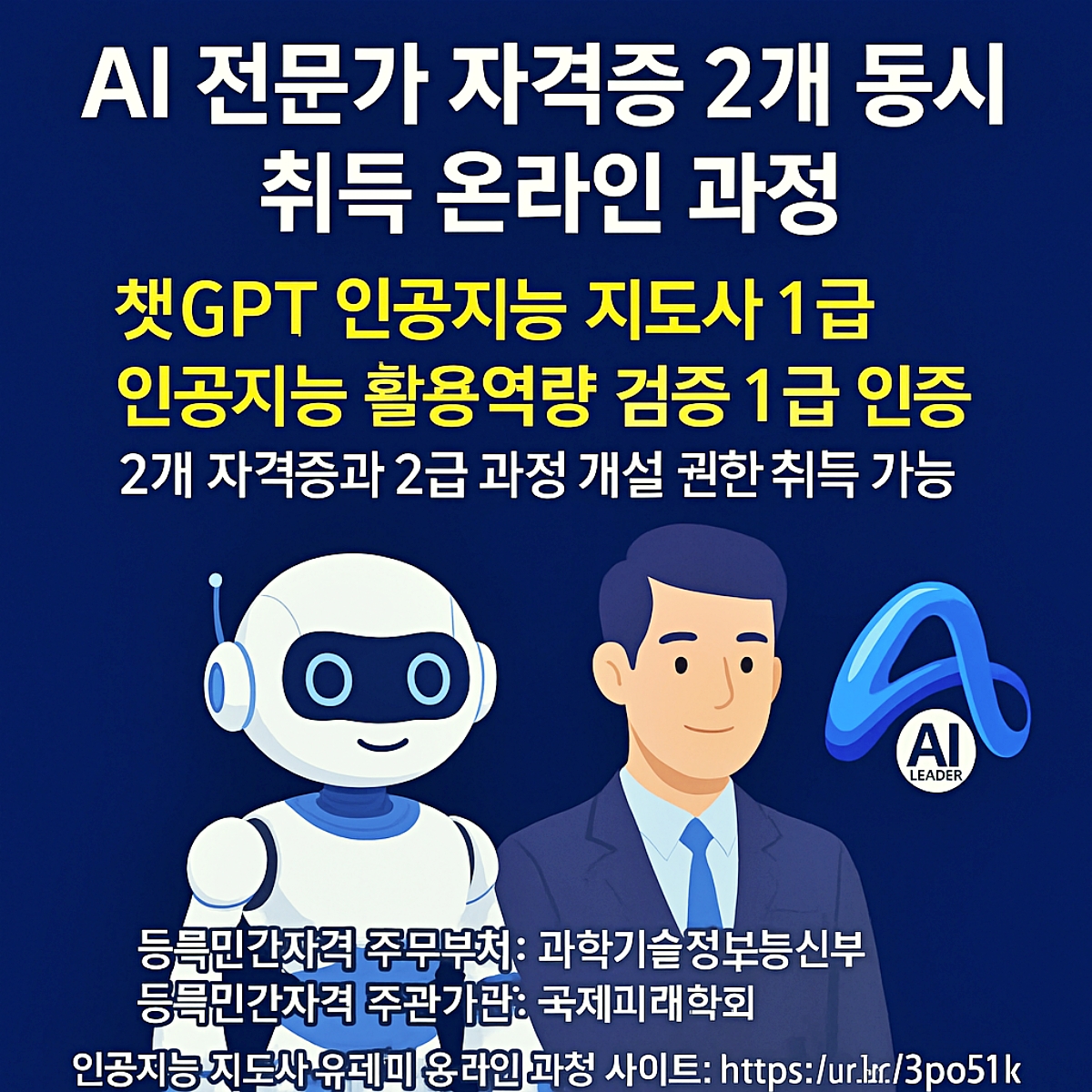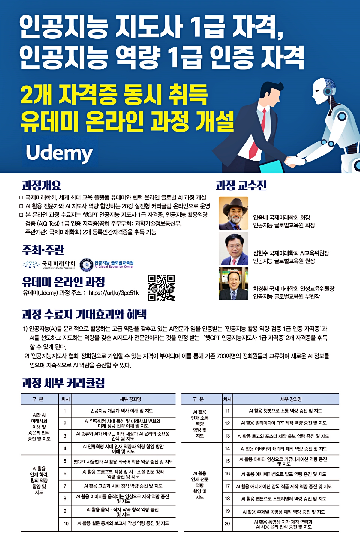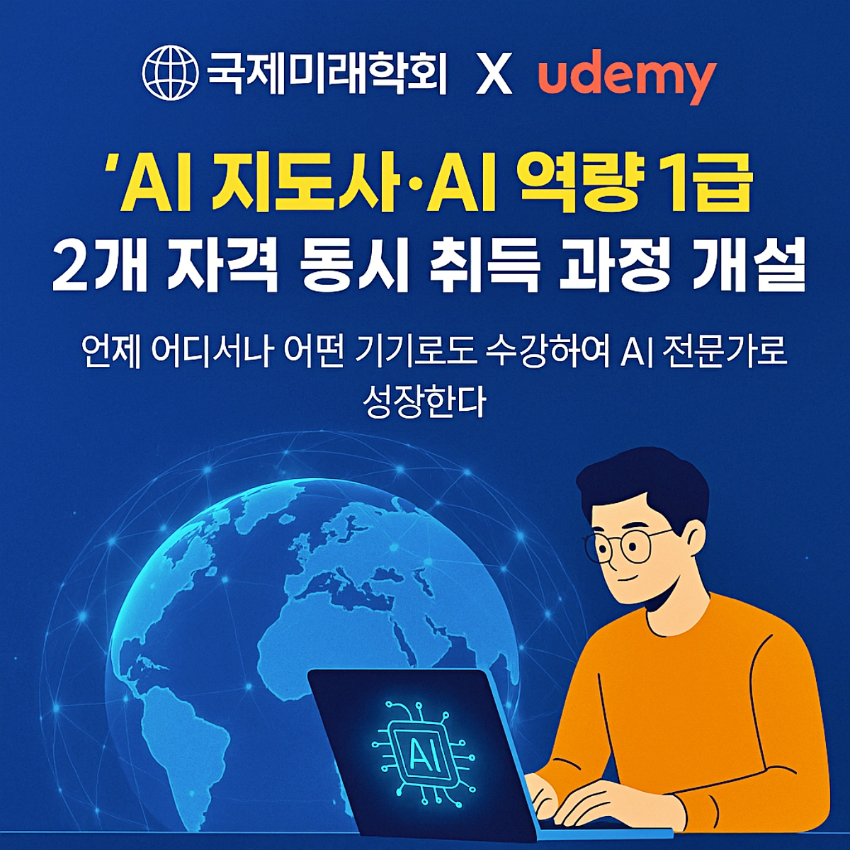 국제미래학회가 유데미와 함께 개설한 인공지능 지도사 1급과 인공지능 활용역량 검증 1급 인증 과정은 단순한 학문적 교육이 아닌 실전 중심의 글로벌 프로그램입니다. 온라인으로 언제든 수강할 수 있고, 수료 후에는 평생 반복 학습이 가능하다는 점이 직장인들에게 특히 매력적입니다.