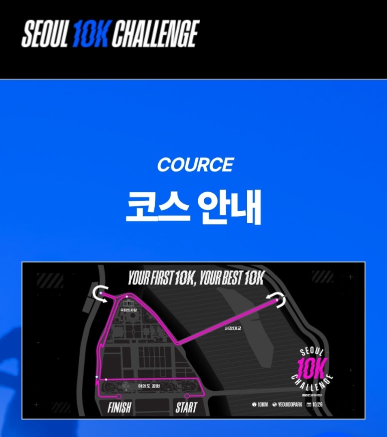 코스는 여의도공원에서 출발해 KBS 본관과 국회의사당을 지나 서강대교 북단에서 반환한 뒤 다시 여의도공원으로 돌아오는 10km 단일 코스입니다.