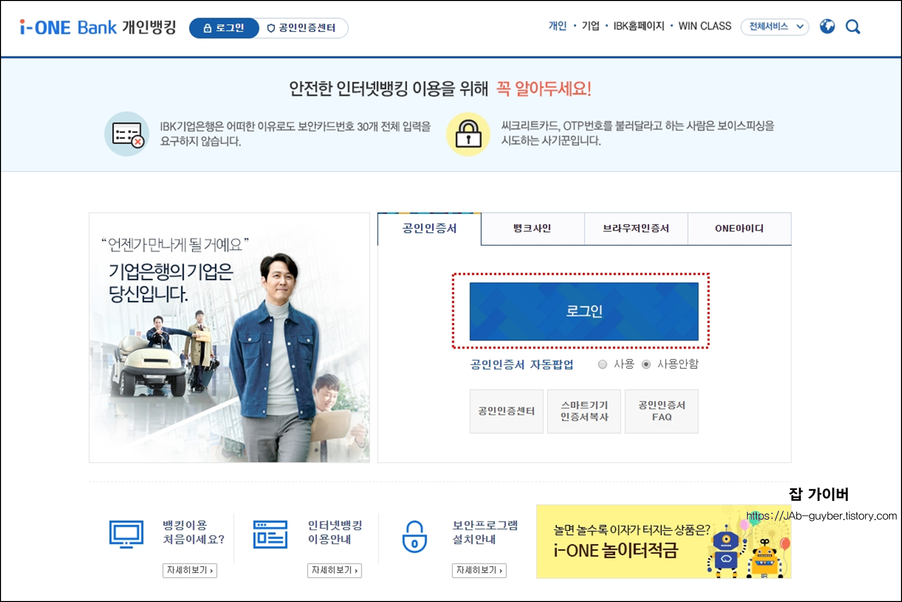 기업은행 사이트 로그인 후 뱅킹 로그인을 진행합니다.