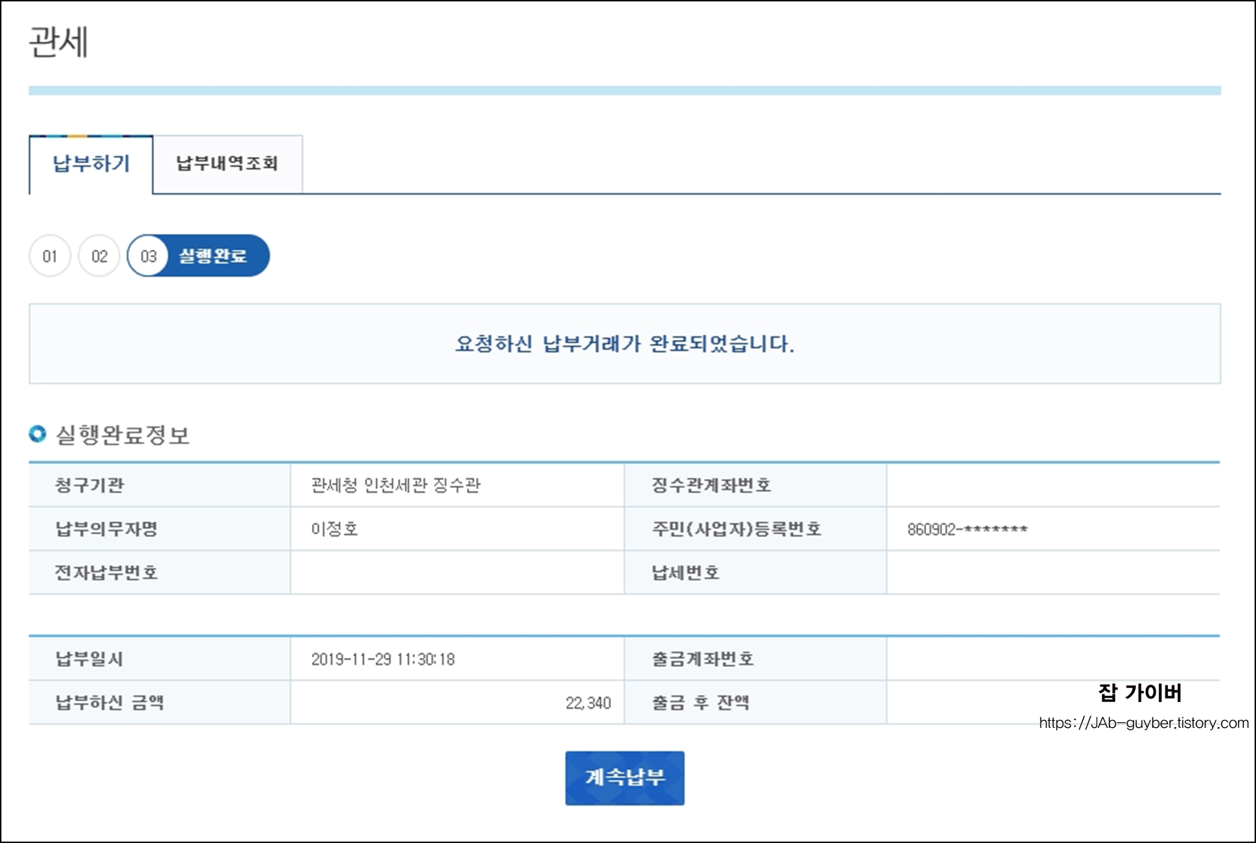 - 관부가세 납부 가능시간 : 매일 00:30 ~ 23:30 (단, 매월 두 번째 토요일 23:30 ~ 익일 07:00 시스템 정기점검으로 납부 불가)