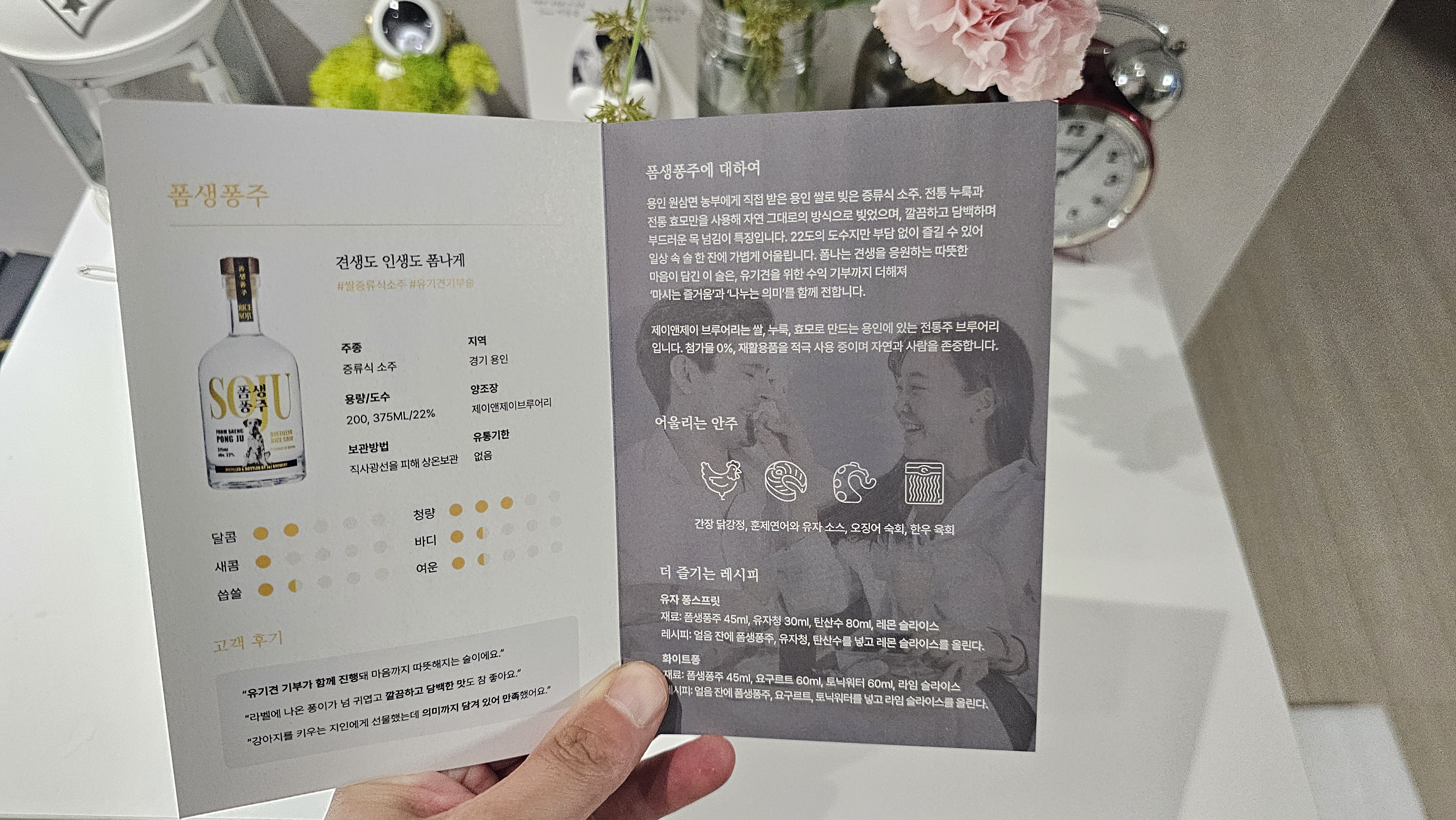 또 하나 인상적이었던 건 테이스팅 카드입니다. 술에 담긴 이야기와 맛의 특징, 어울리는 안주까지 정리돼 있어 술을 훨씬 더 깊게 즐길 수 있었습니다. 국화주는 치킨과 잘 어울렸고, 추사주는 초밥과 곁들였을 때 은은한 풍미가 더해져 새로웠습니다. 주말에 와이프와 함께 치킨, 초밥, 샐러드에 곁들이니 집이 마치 작은 전통주 바처럼 느껴졌습니다.