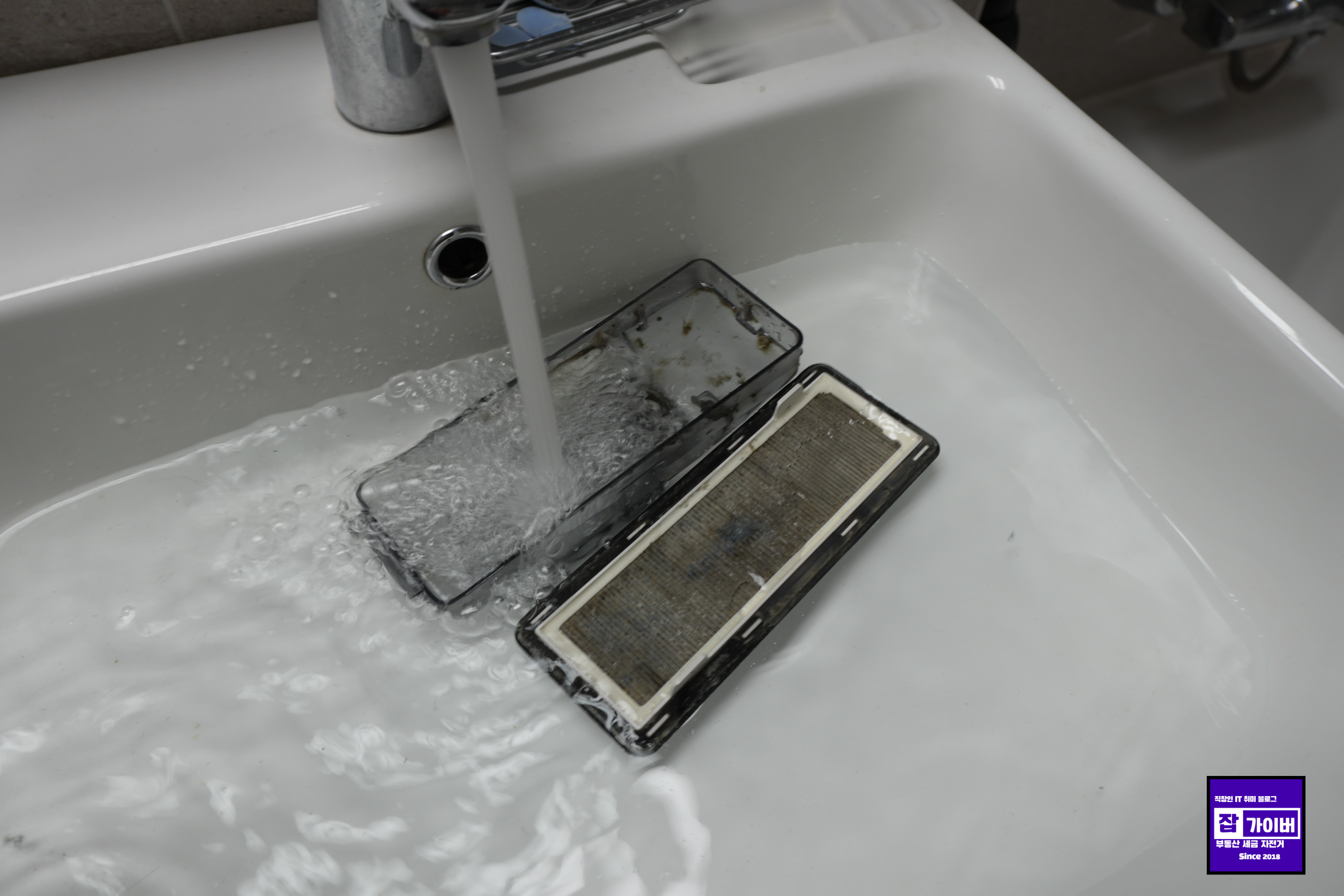 흐르는 물에 여러 번 흔들어 씻고, 큰 먼지는 먼저 털어낸 뒤 필터 안쪽까지 물살로 밀어내니 덩어리처럼 뭉친 먼지들이 쏙쏙 빠져나왔습니다. 확실히 그냥 솔로 털어내는 것과는 차원이 달랐어요.