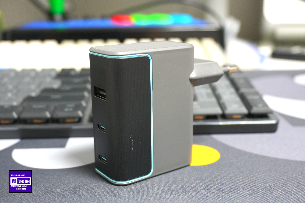 우선 충전기는 USB-A 1개와 USB-C 2개, 총 3개의 포트를 지원해서 노트북, 스마트폰, 카메라 같은 다양한 기기를 동시에 충전할 수 있습니다.