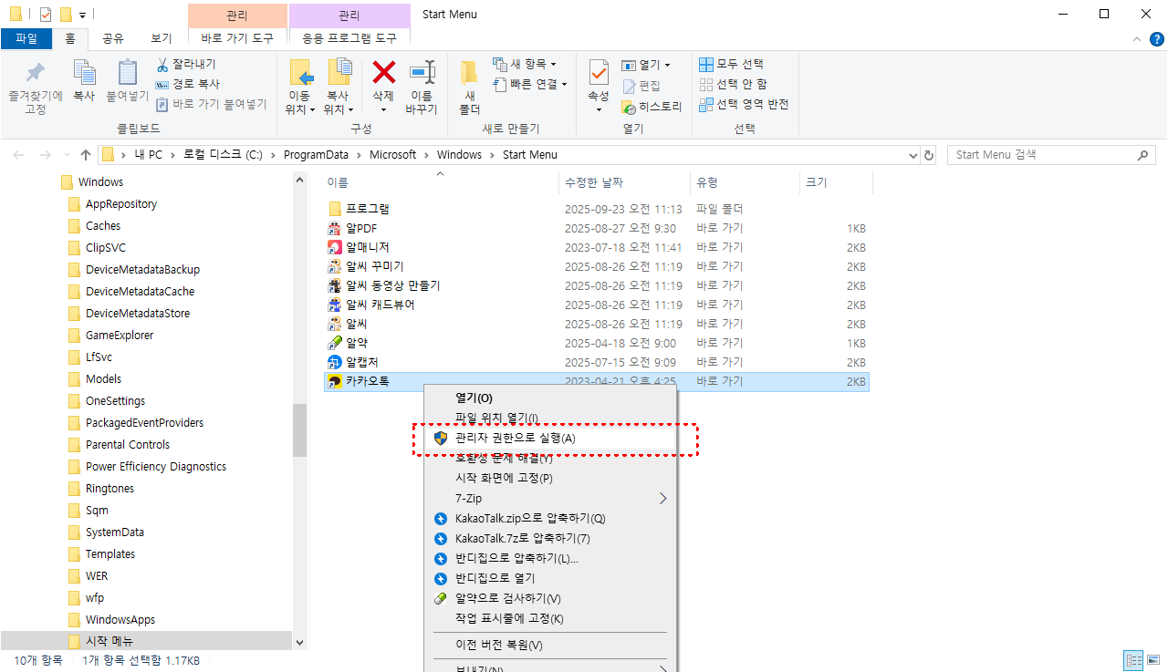 주요 업데이트 직후 실행이 멈춘다면 설치 경로의 KakaoTalk 실행 파일을 마우스 오른쪽 버튼으로 열고 관리자 권한으로 실행을 시도합니다.