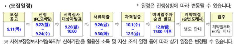 - 9월 26일 공고 → 10월 접수 → 1월 발표 → 내년 8월 입주