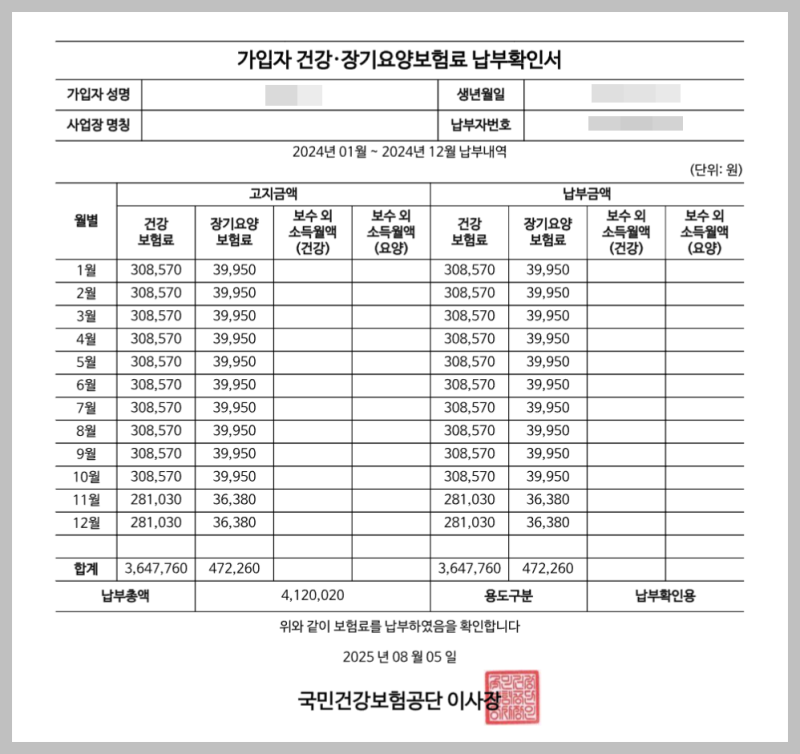 - 건강보험료 납부 내역 : 정부24 → ‘건강보험 납부확인서’ 발급