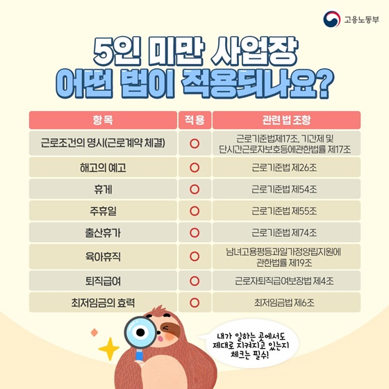 - 최저임금 준수(최저임금법 제6조) 규모와 무관하게 적용되며 위반 시 형사처벌 대상이다.