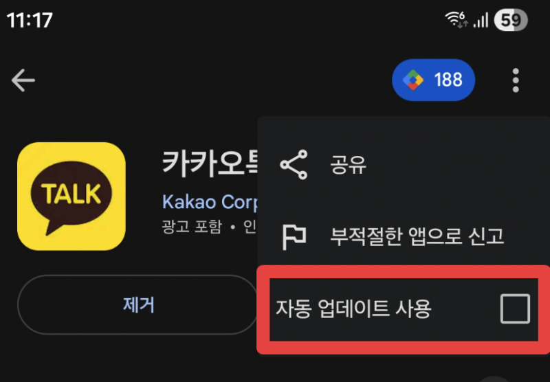 이렇게 하면 다른 앱은 정상적으로 업데이트되지만 카카오톡만 자동으로 막을 수 있다.
