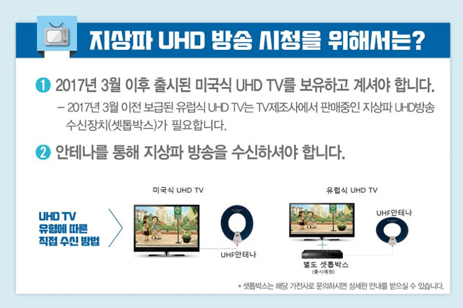 - 한국에서 지상파 UHD TV 방송을 수신하려면 국내 방송 규격인 ATSC 3.0 튜너가 TV에 필수적으로 내장되어 있어야 합니다.