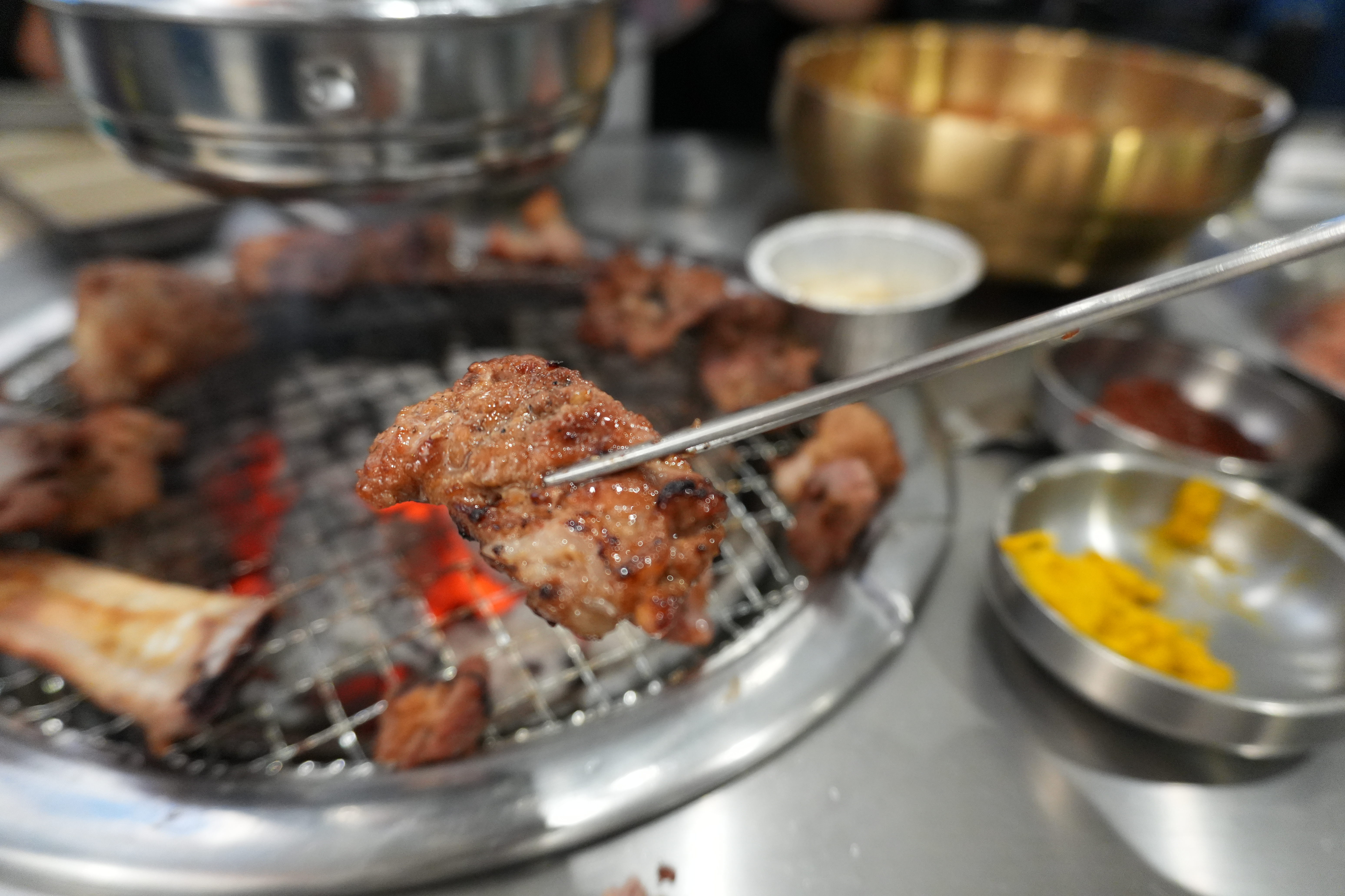 양념갈비는 단맛과 짠맛의 균형이 좋아서 물리지 않고, 생갈비는 고기 본연의 풍미가 살아 있다.