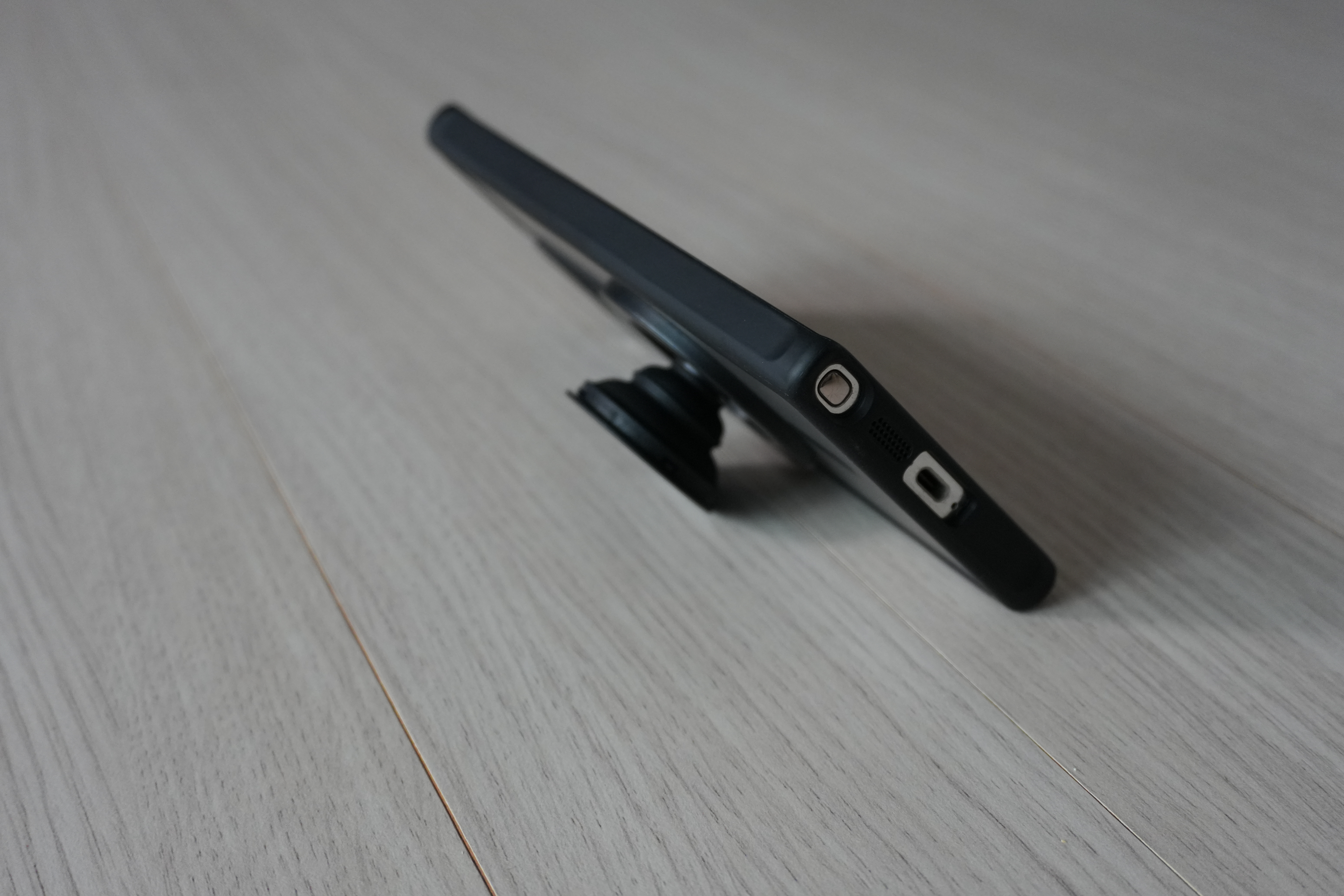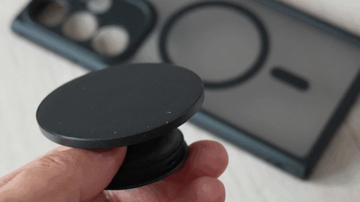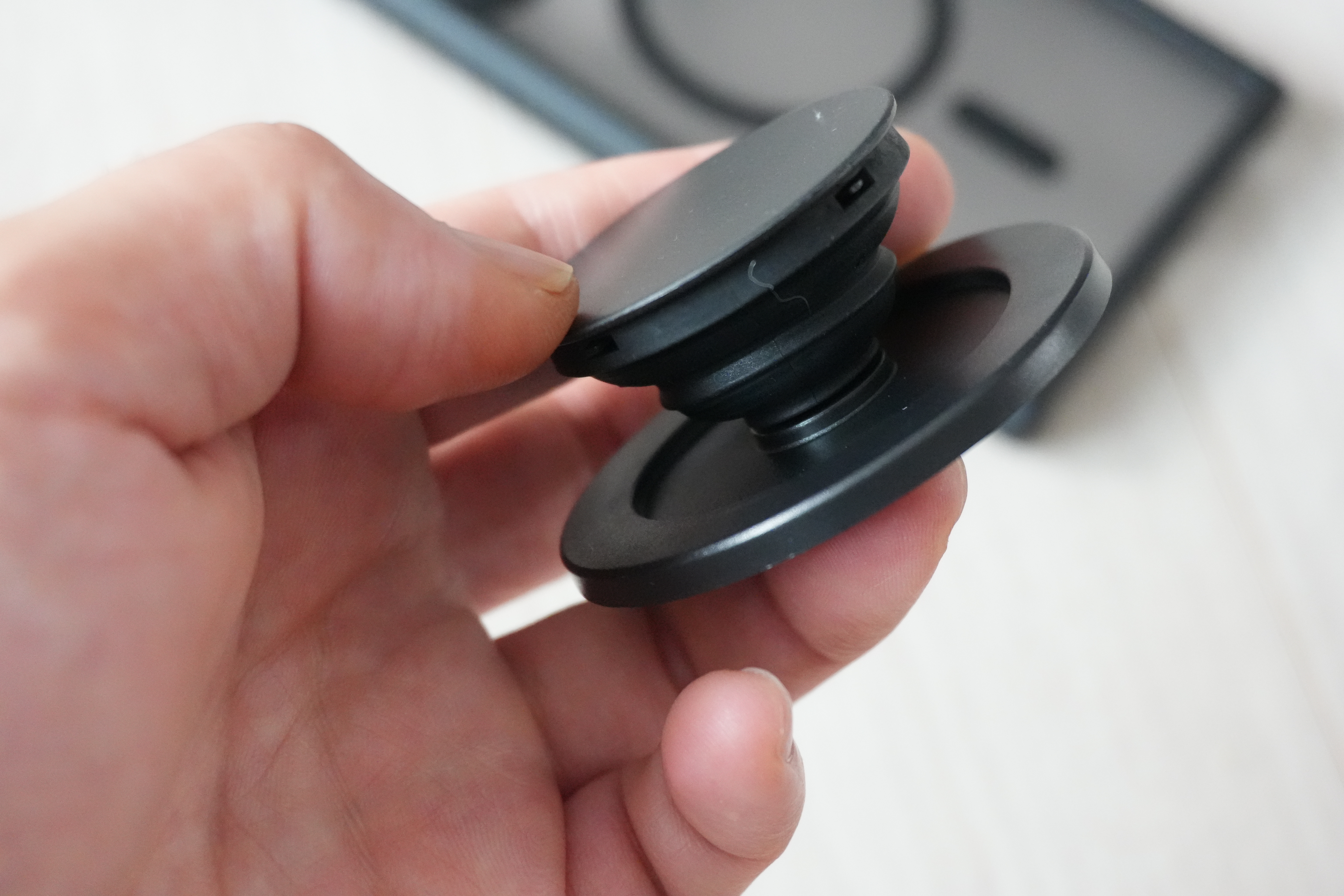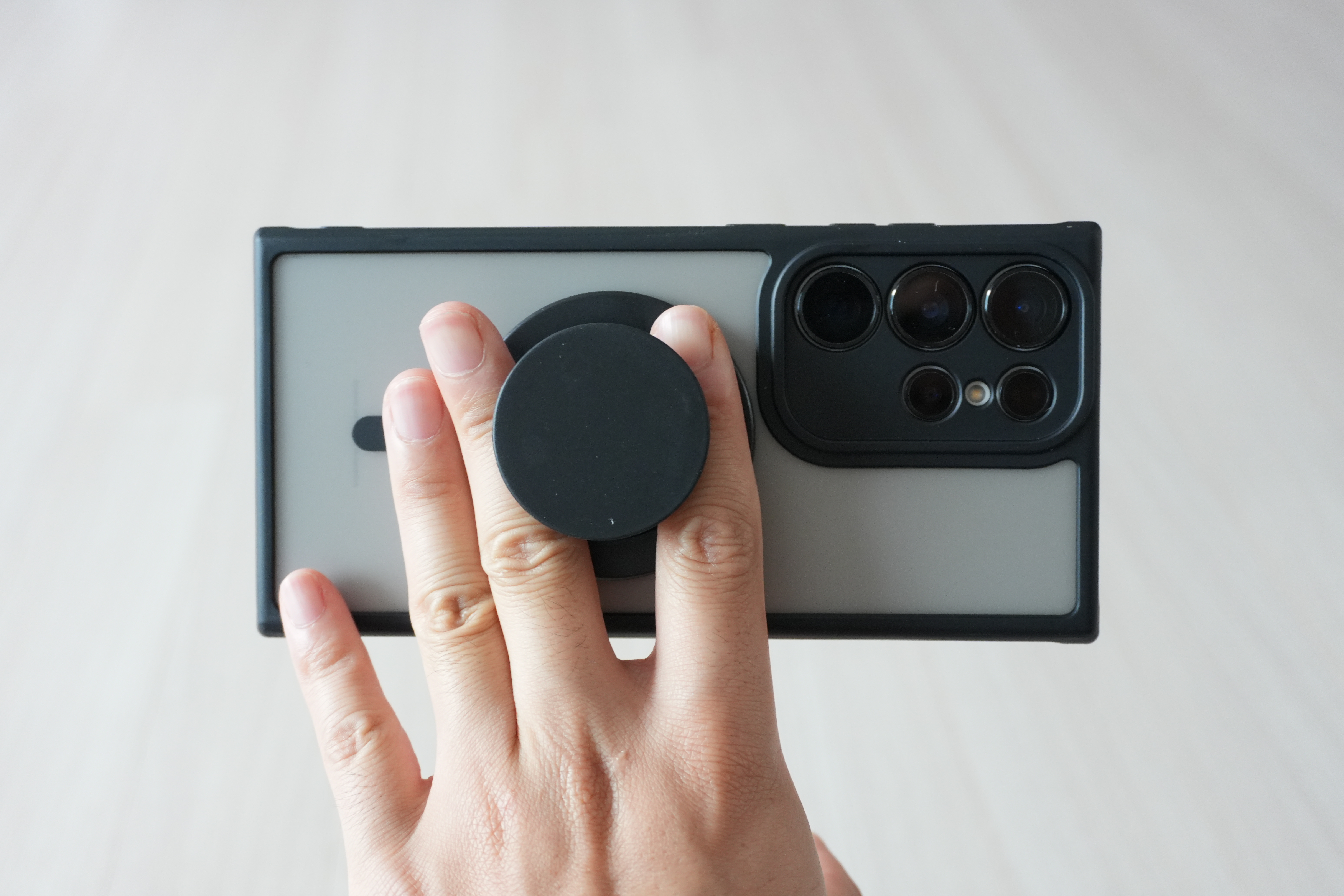 색상과 마감이 케이스와 찰떡이라 마치 세트 제품처럼 보인다. 실제로 붙였다 뗄 수 있어서 필요할 때만 사용하기에도 좋고, 영상을 볼 때 세워두거나 사진 찍을 때 손에 끼워서 사용할 수 있어 실용성이 높다.