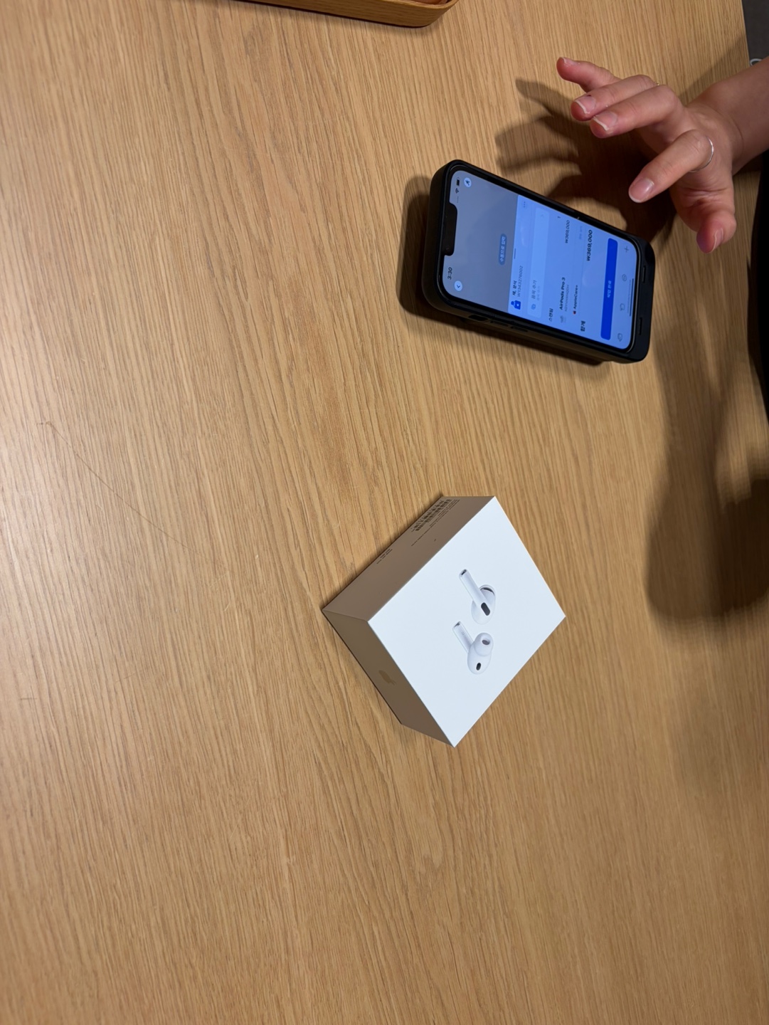 먼저 대기 팀은 두 팀 정도 있었고, 실제 기다린 시간은 약 2~3분 정도. 직원이 결제 내역을 확인하자마자 박스를 바로 건네주더군요. 포장도 깔끔했고, 박스 개봉 시 특유의 정숙한 ‘에어팟 언박싱 감성’이 그대로 느껴졌습니다.
