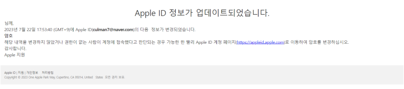 나중에 확인해 보니, 메일 주소는 @apple-security-alert.com이었고, 실제 애플 도메인인 @apple.com과 전혀 다른 피싱 사이트였습니다.