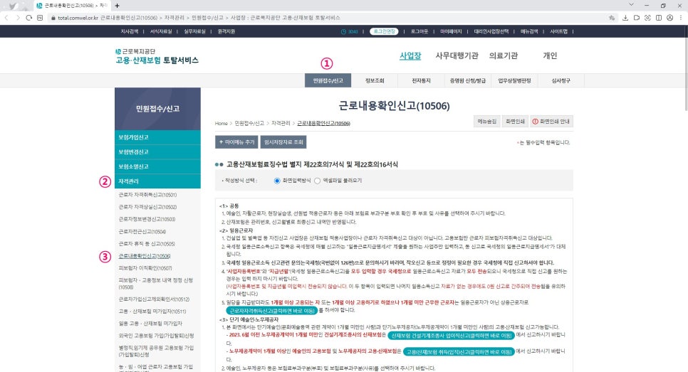 요즘은 대부분의 사업장이 근로복지공단 고용산재보험 토탈서비스 (total.comwel.or.kr) 를 이용해 온라인으로 신고합니다.